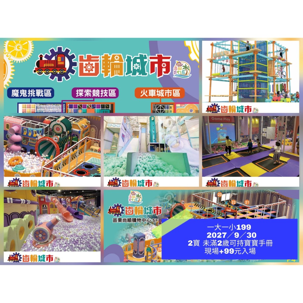 1、本券可1大1小全區全日𣈱玩頭份尚順5F追風奇幻島 【齒輪城市】(六歲以下需全程陪同一位大人入場)