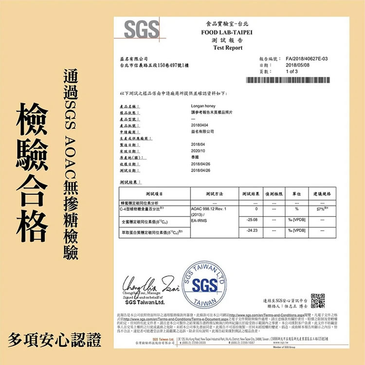 AOAC認證:國際分析化學家協會簡稱AOAC,是目前國際間普遍用來檢測蜂蜜真偽的方式。