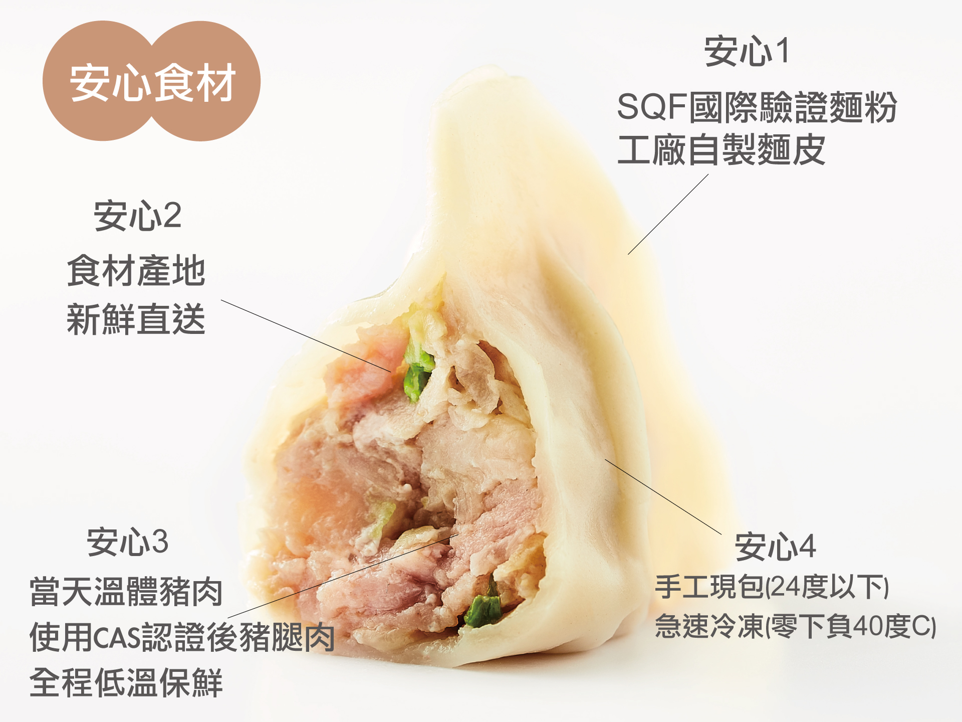 全程低溫手工製作,保持肉品與食材的新鮮,完成後便立即送入急速冷凍室,以確保水餃品質。讓每個顧客吃到的水餃如同剛製作完成一般新鮮美味。