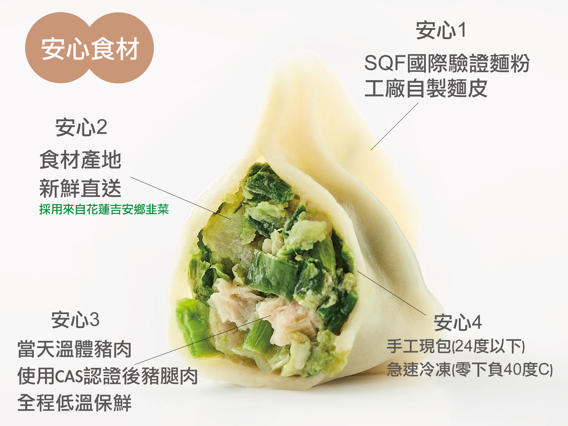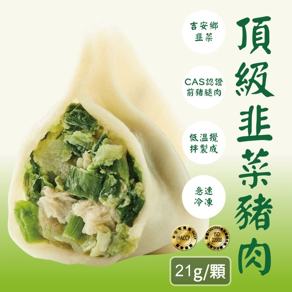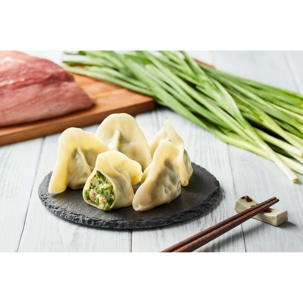 韭菜豬肉手工水餃─採用來自好山好水花蓮吉安鄉韭菜、CAS認證前豬腿肉,低溫攪拌製成,入口後辛香甘甜滋味濃郁,喜愛韭菜的您千萬不能錯過!