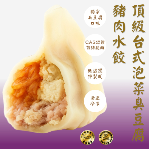 結合台式泡菜的微酸甘甜與臭豆腐的獨特風味,再加入當天現宰的溫體豬肉,一口咬下,先是泡菜清脆爽口,緊接著臭豆腐香氣四溢,鹹香層次豐富,搭配Q彈餃皮,是台味控不能錯過的必吃選項!