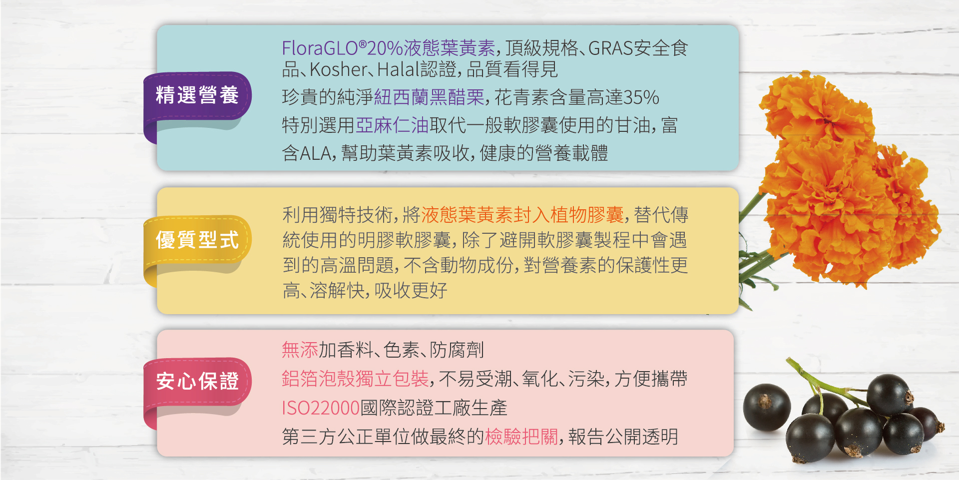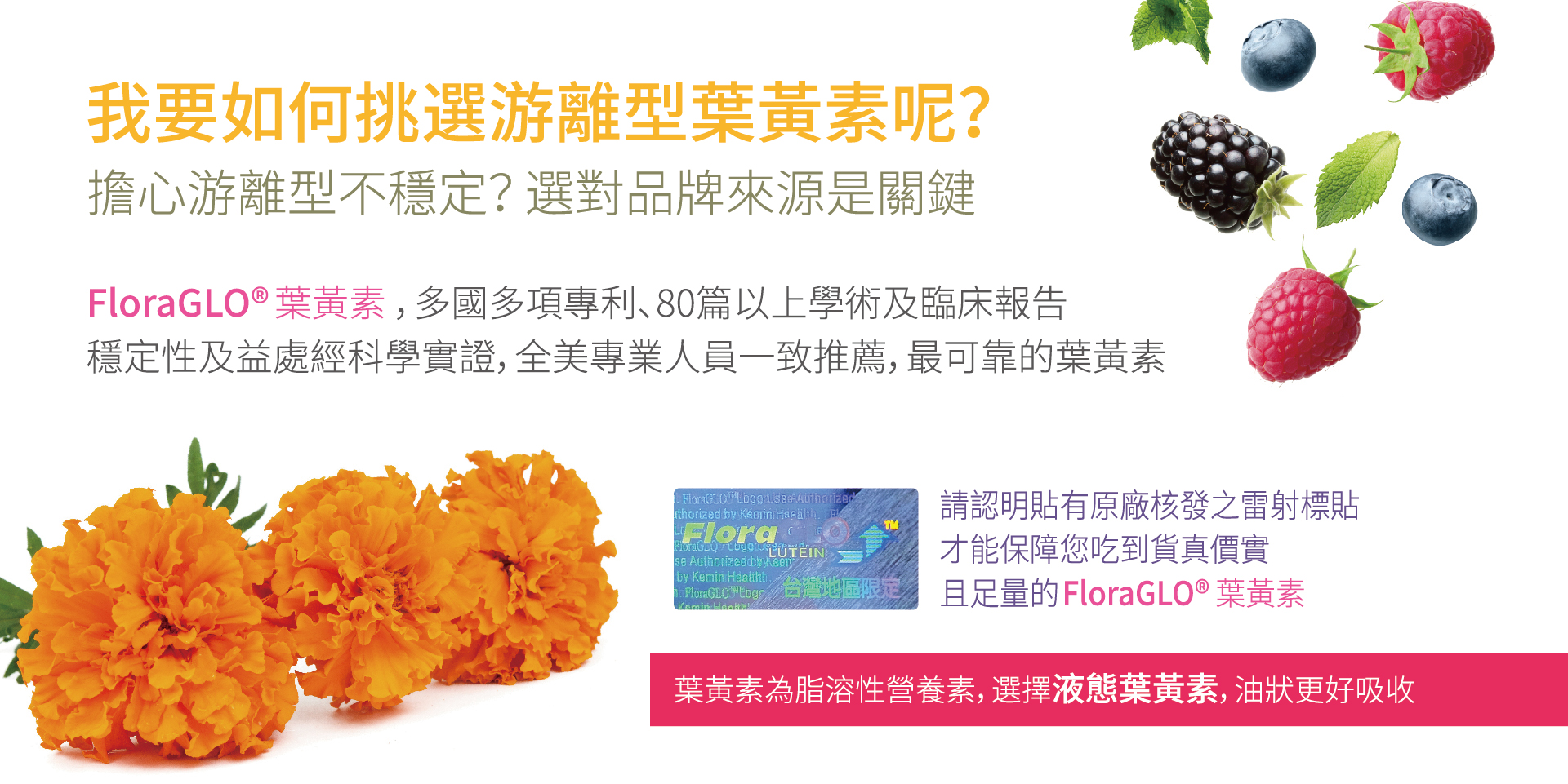 ‧FloraGLO ®游離型葉黃素:多國多項專利、80篇以上學術、臨床報告,穩定性及益處經科學實證,全美專業人員一致推薦。