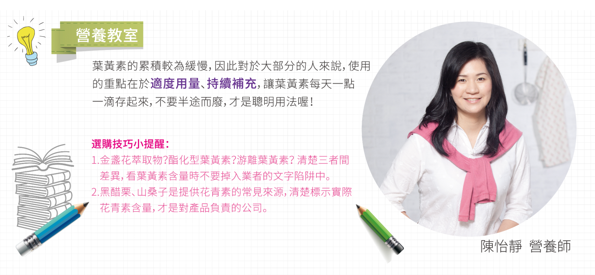 根據研究建議,每日持續補充6-10毫克葉黃素並搭配花青素等多酚類,是保養的關鍵所在。