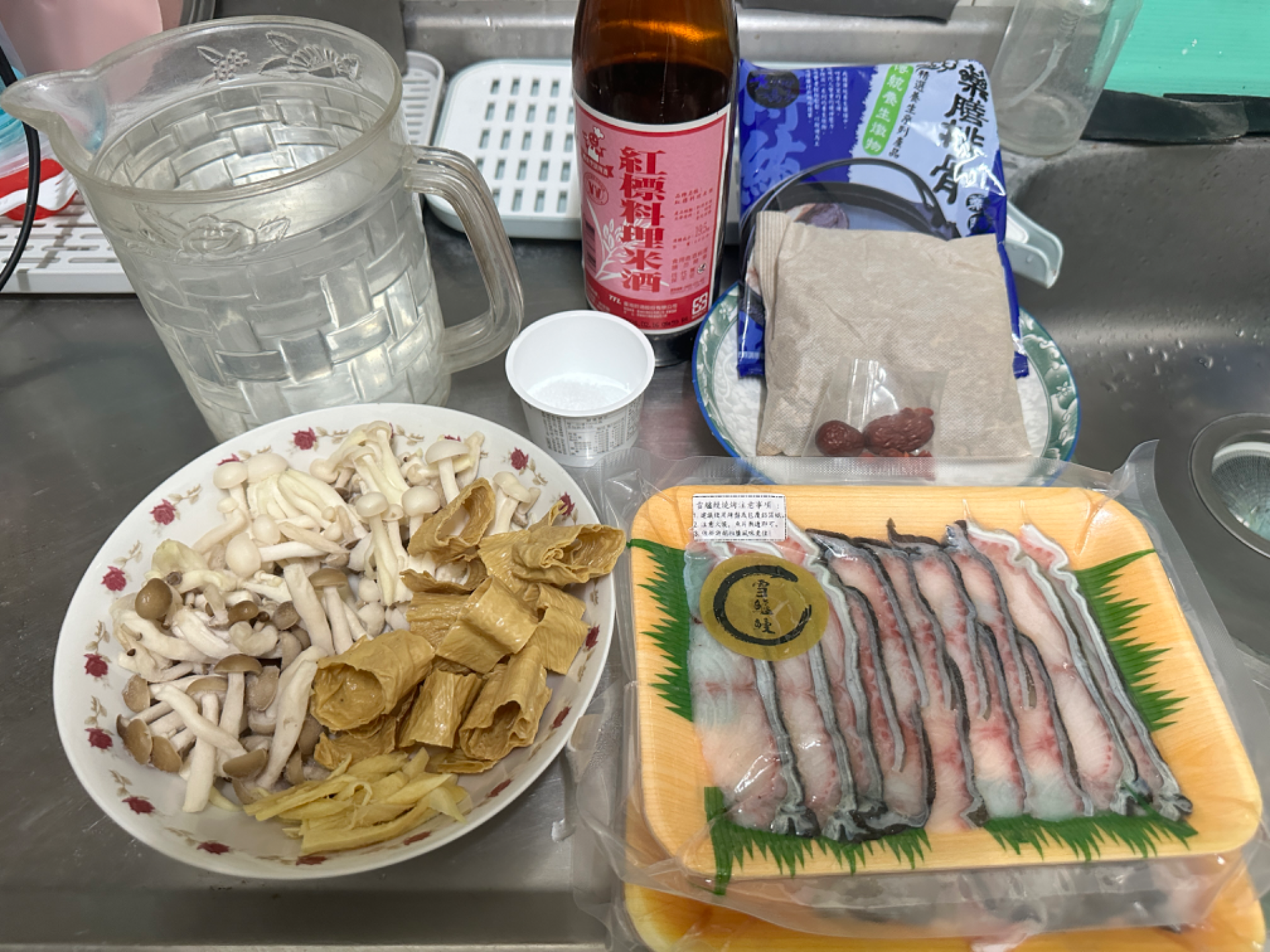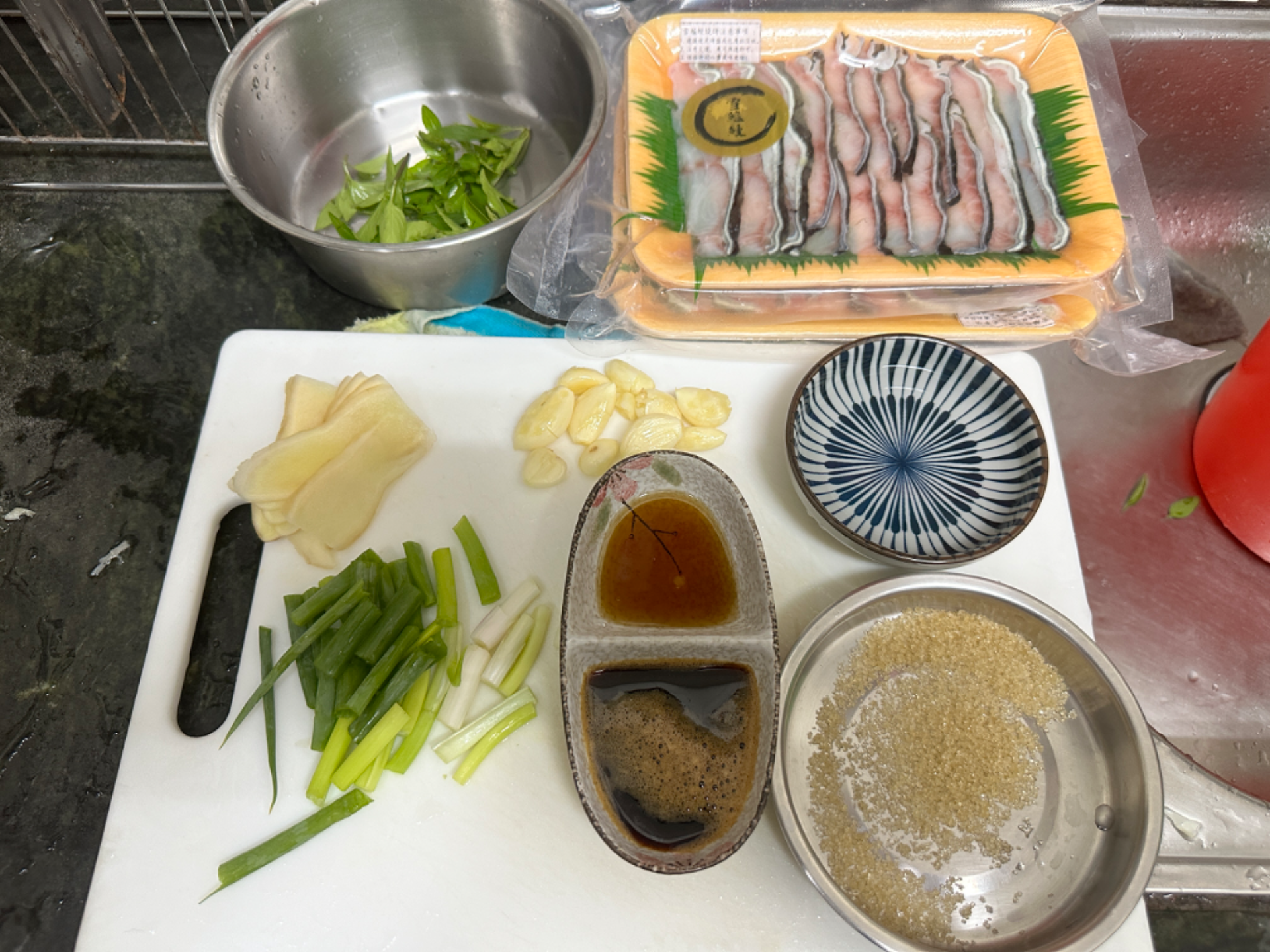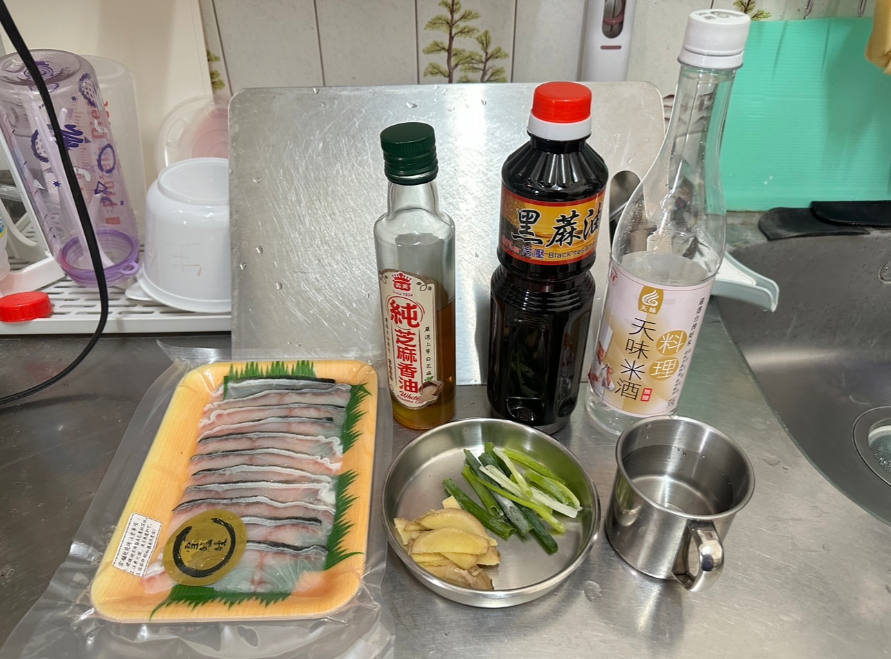🧑🍳食材準備:雪鱸鰻魚片(1~2盒)、芝麻香油、黑麻油、米酒、薑片、蔥段、鹽、雞粉、水(些許)。