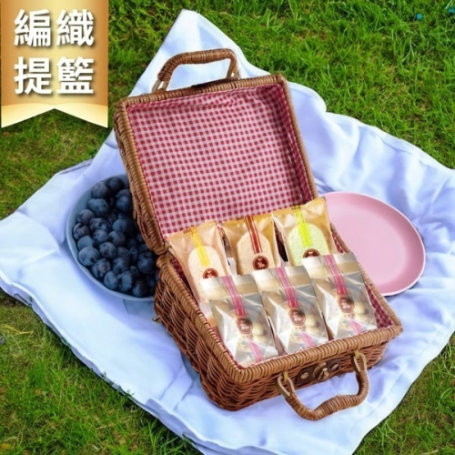 【內容物】原味法式鳳梨酥*1、紅茶法式鳳梨酥*1、綠茶法式鳳梨酥*1、原味養生堅果塔*3、編織風野餐提籃