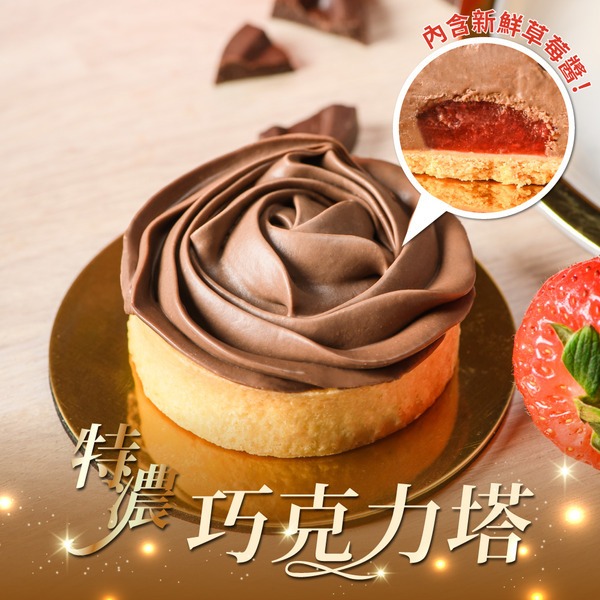 冬季新品上市,特濃巧克力塔,每一口都吃的到頂級72%巧克力濃郁,包裹新鮮草莓醬豐富口感,搭配酥脆奶油香塔殼,100%天然原色不添加人工色素。