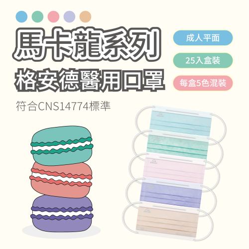 格安德平面醫用口罩,成人款25入盒裝 馬卡龍系列