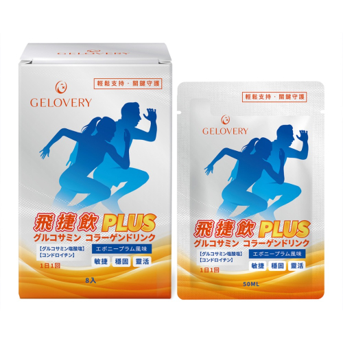 【飛捷飲PLUS】 由內而外,提升關鍵保養!💧✨ 這款專業保養配方,嚴選多重關鍵營養,讓行動與活力一次兼顧: ✅ 鮭魚鼻軟骨萃取物(非變性二型膠原蛋白) – 幫助維持正常行動機能,支撐日常不卡卡! ✅ 魚膠原蛋白 + 維生素C – 提供營養補給,幫助膠原形成,展現青春美麗光采! ✅ 透明質酸鈉(玻尿酸) – 幫助維持消化道機能,促進新陳代謝,健康感upup。 ✅ 維生素D3 – 幫助牙齒骨骼正常發育,維持體內鈣質平衡。 ✅ 烏梅蜜 – 清爽酸甜、開胃順口,調節生理機能、滋補強身! 💫 全天候潤活支持,內外兼修的關鍵新選擇! 無論日常保養、運動後補給,或需要活力支援時,隨時補充健康能量! 【產品規格】 單包50 ml,每盒8包,共8份。 【關鍵成份(每份)】 鹽酸鹽葡萄糖胺 1500mg 甲基硫醯基甲烷 Optimsm 250mg 鮭魚鼻軟骨萃取物(非變性二型膠原蛋白)PCTII 40mg 流行鏈球菌發酵物(含透明質酸鈉) Hyabest 80mg 維生素C 100mg 【使用方式】 每日1包,撕開即可飲用,或搭配常溫水食用。 【警語】 1.本產品含有牛奶、魚類、甲殼類製品,不適合對其過敏體質者食用。 2.避免睡前食用,孕婦及哺乳期婦女使用前應先諮詢醫師。