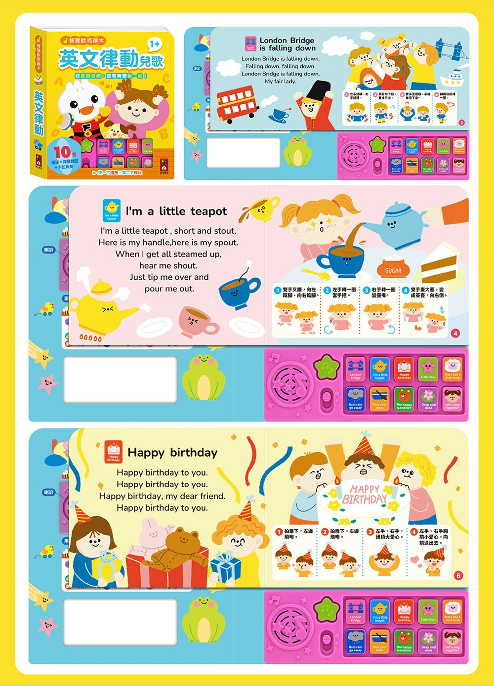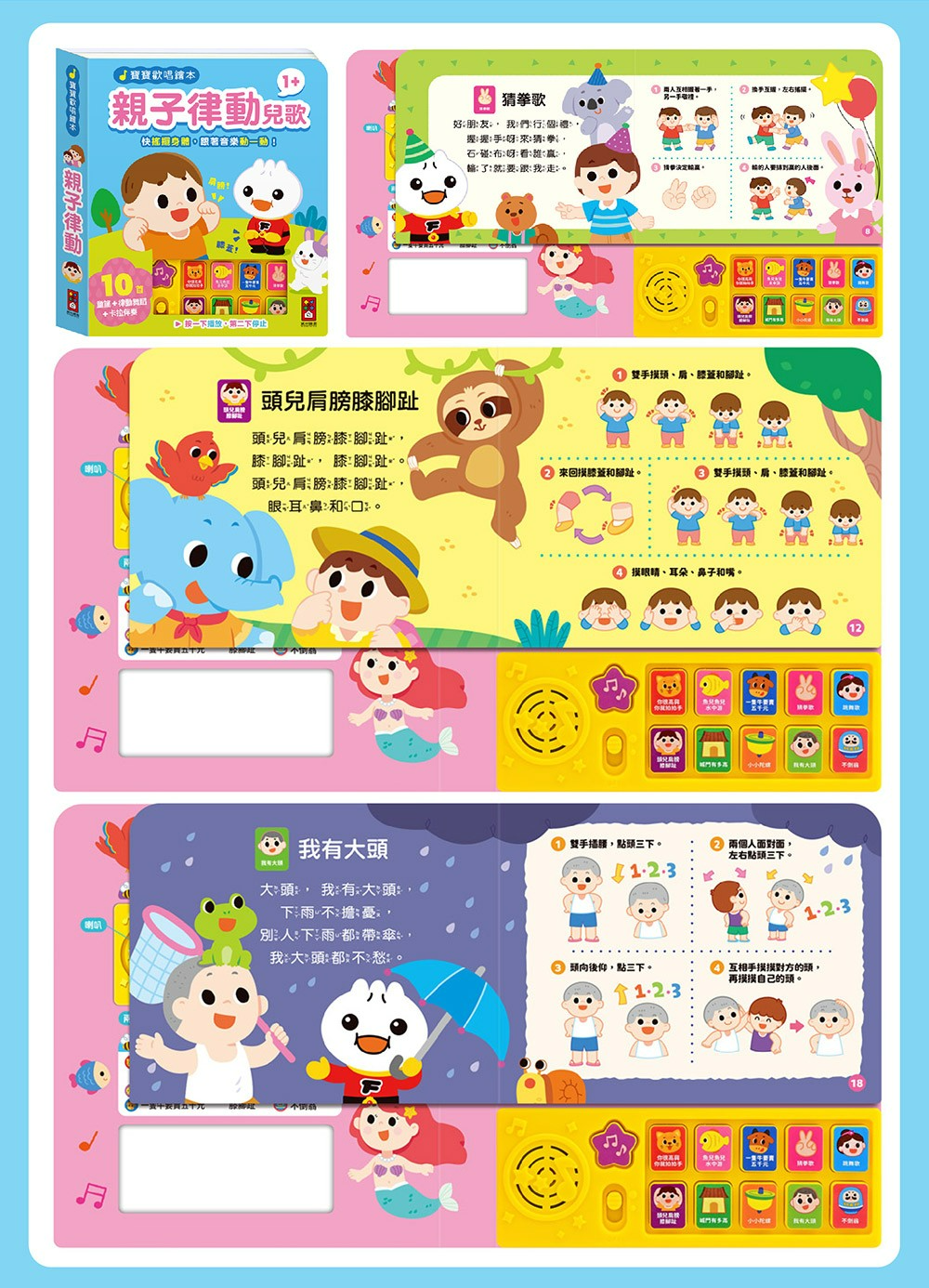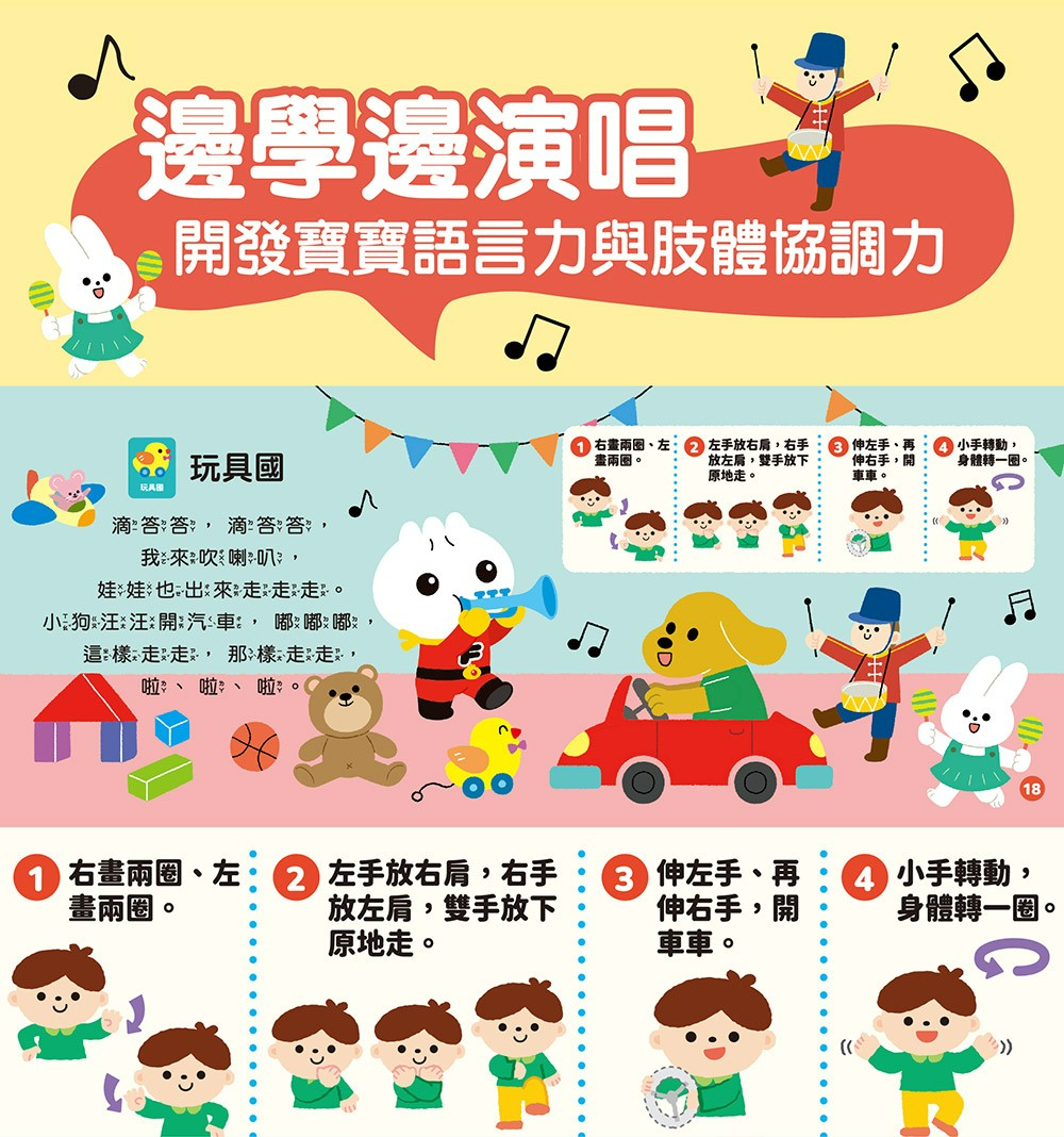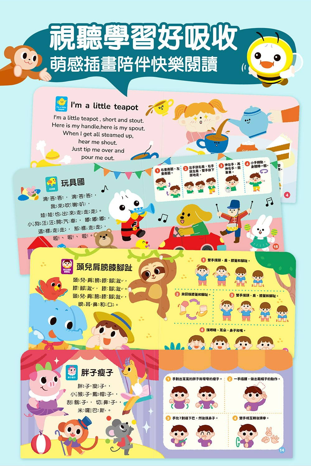 每一首歌都有不同的圖示唱跳步驟,讓孩子跟著歌詞一起動一動、唱唱跳跳!