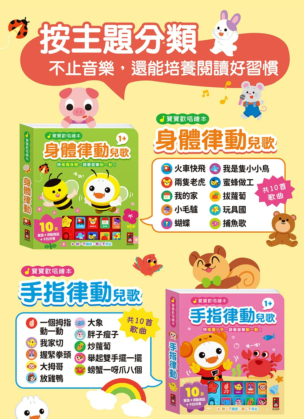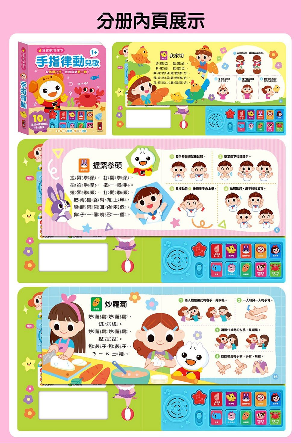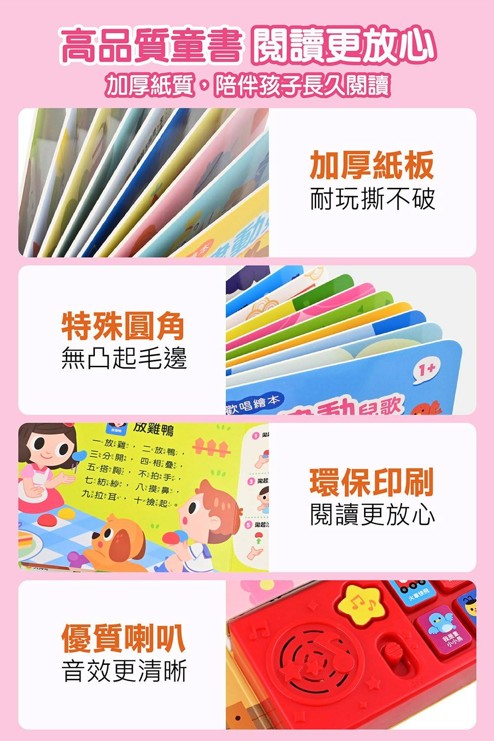 小手輕輕按,即可聽到可愛又童趣的歌謠與音樂伴奏,刺激聽覺發展。