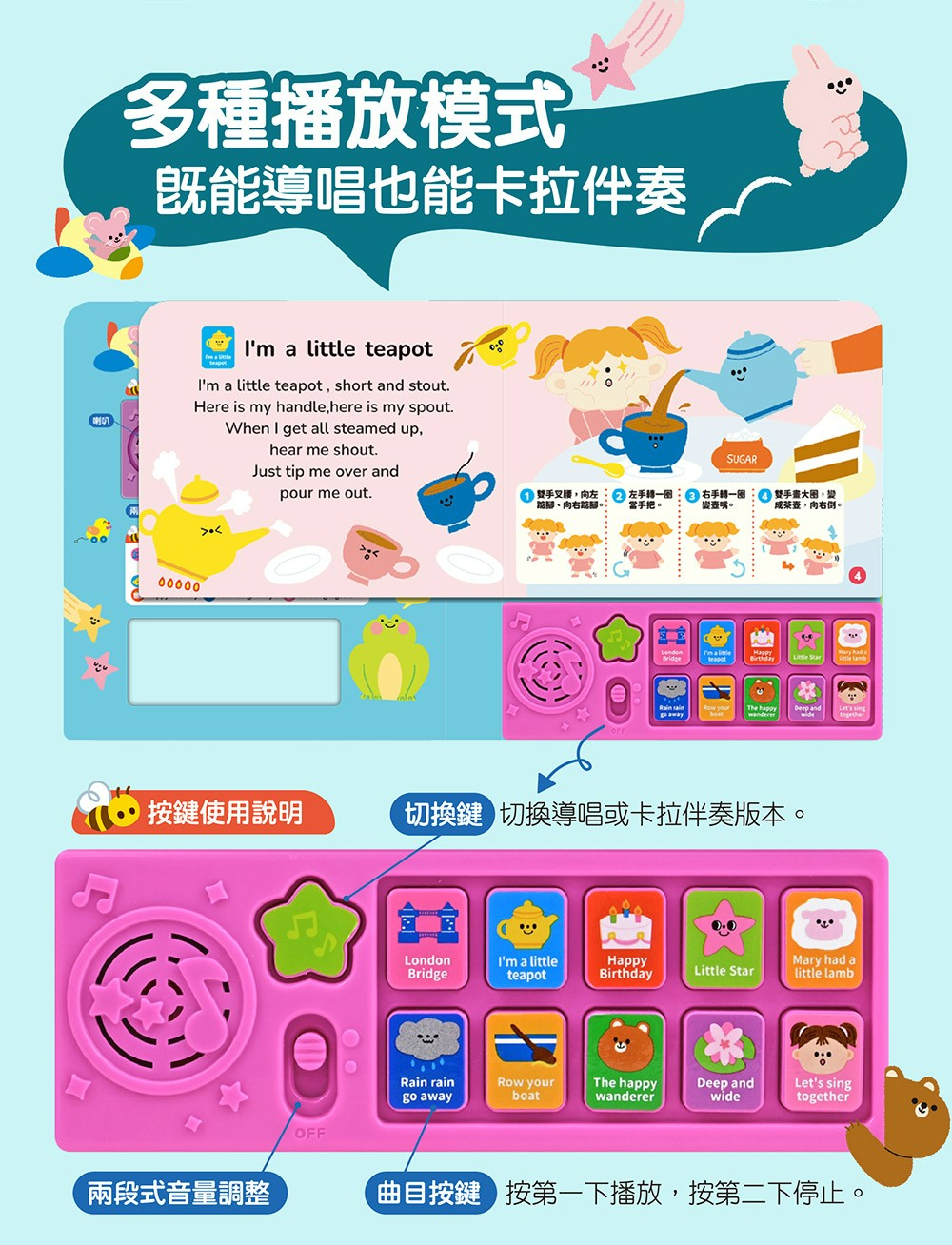 兩段式音量調整可切換大小聲,並有10首歌的音樂按鈕,隨點即發聲,按第一下撥放,按第二下停止,且亦有切換鍵,可切換導唱與卡拉伴奏音樂,讓孩子學唱歌、跟著音樂一起搖擺動一動。