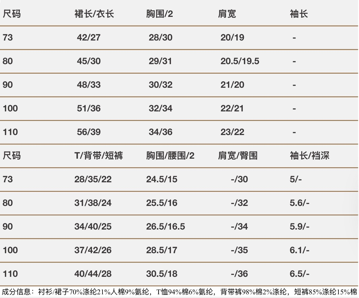 ✧ 𝕄𝕒𝕥𝕖𝕣𝕚𝕒𝕝:襯衫裙子 70%滌綸21%人棉9%氨綸;T恤94%棉6%氨綸;背帶98%棉2%滌綸;短褲85%滌綸15%棉