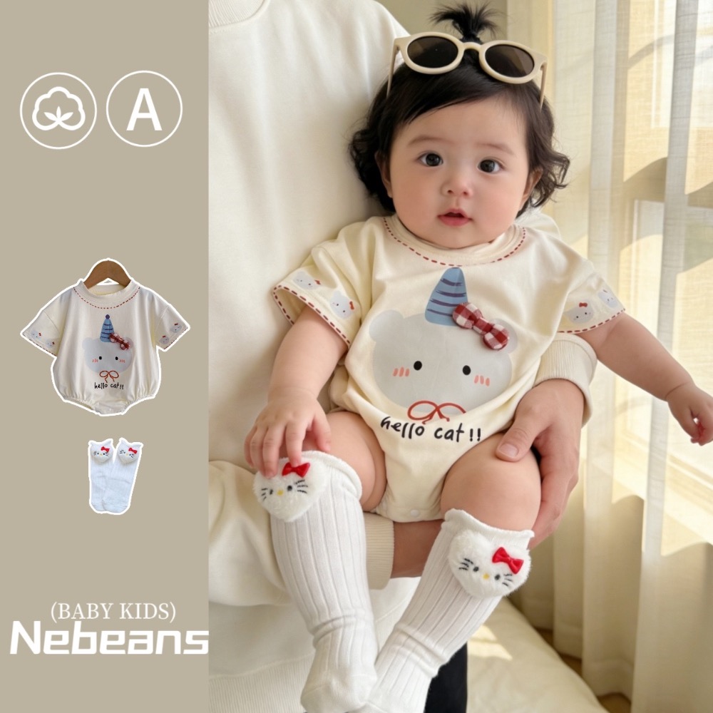 寶寶夏季米色貓貓蝴蝶結短袖包屁衣(含襪子)