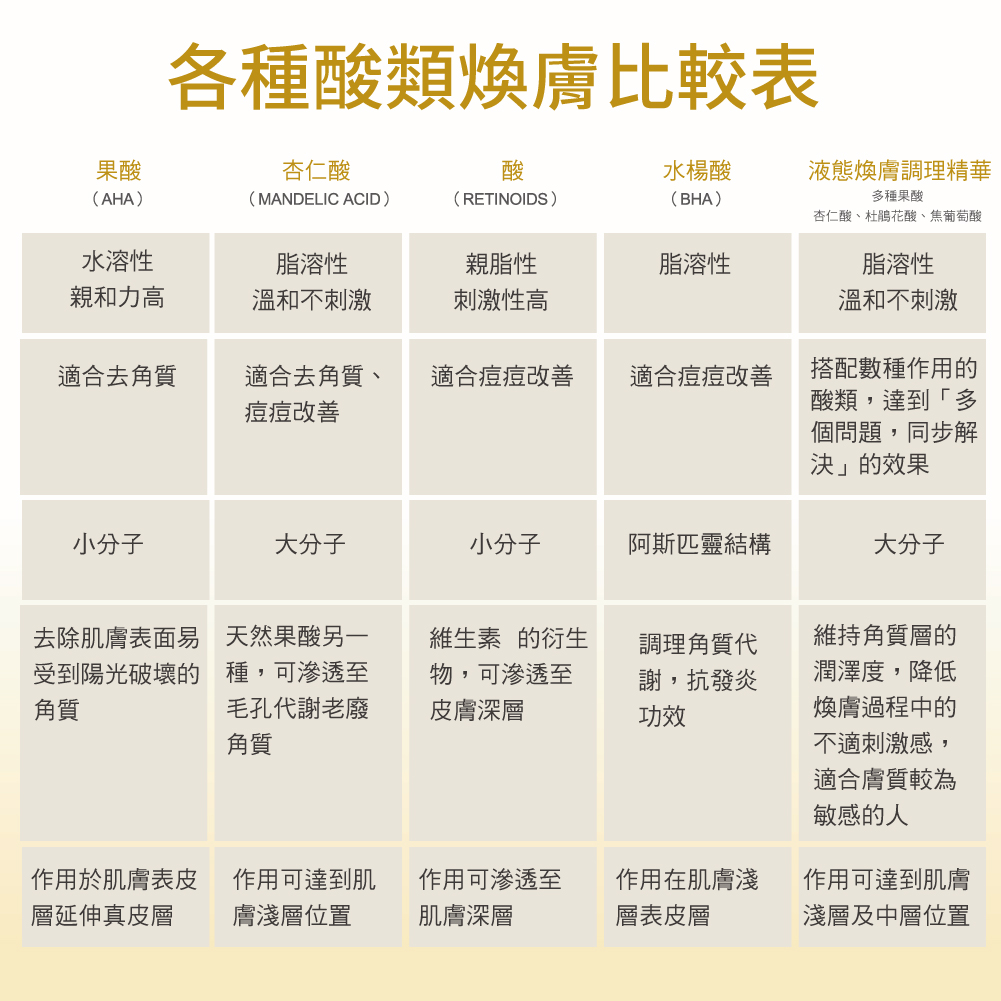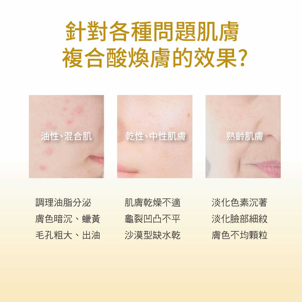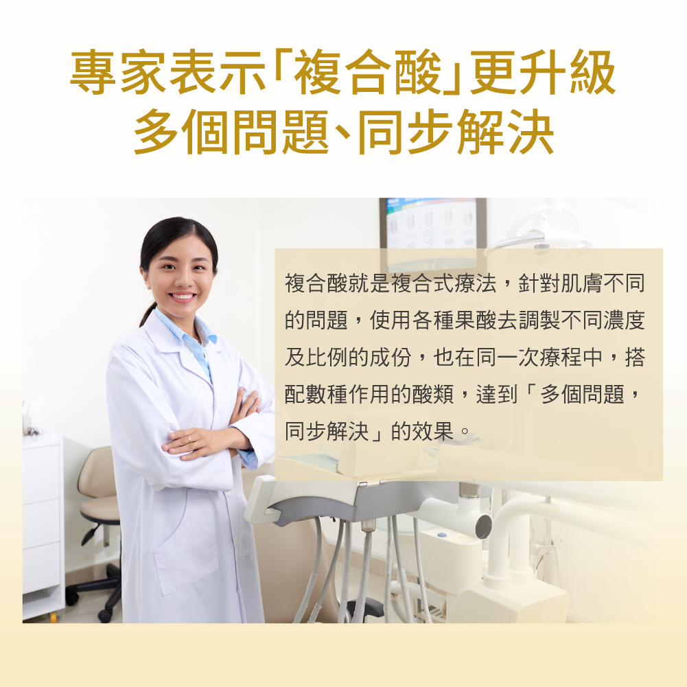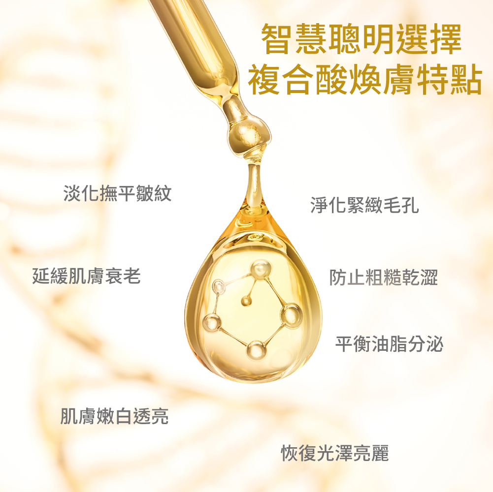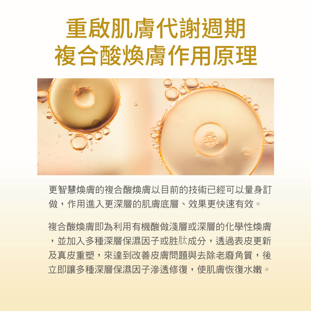 更智慧煥膚的複合酸煥膚以目前的技術已經可以量身訂做,作用進入更深層的肌膚底層、效果更快速有效。複合酸煥膚即為利用有機酸做淺層或深層的化學性煥膚,並加入多種深層保濕因子,透過表皮更新及真皮重塑,來達到改善皮膚問題與去除老廢角質,後立即讓多種深層保濕因子滲透修復,使肌膚恢復水嫩。