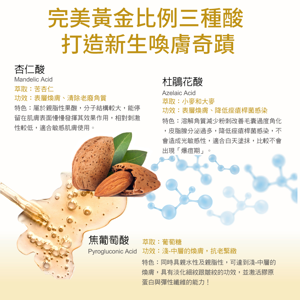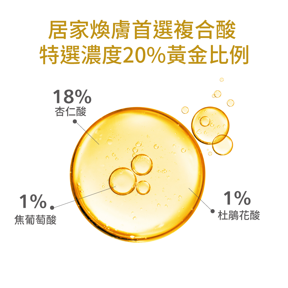 Exclusive “Triple Acid” technology reboots skin’s metabolic cycle. Featuring 20% golden ratio: 18% mandelic acid, 1% azelaic acid, and 1% pyruvic acid to exfoliate, clear pores, control oil, and inhibit bacteria. DMI technology delivers low molecular weight hyaluronic acid, B5, and aloe vera for deep hydration and renewal.