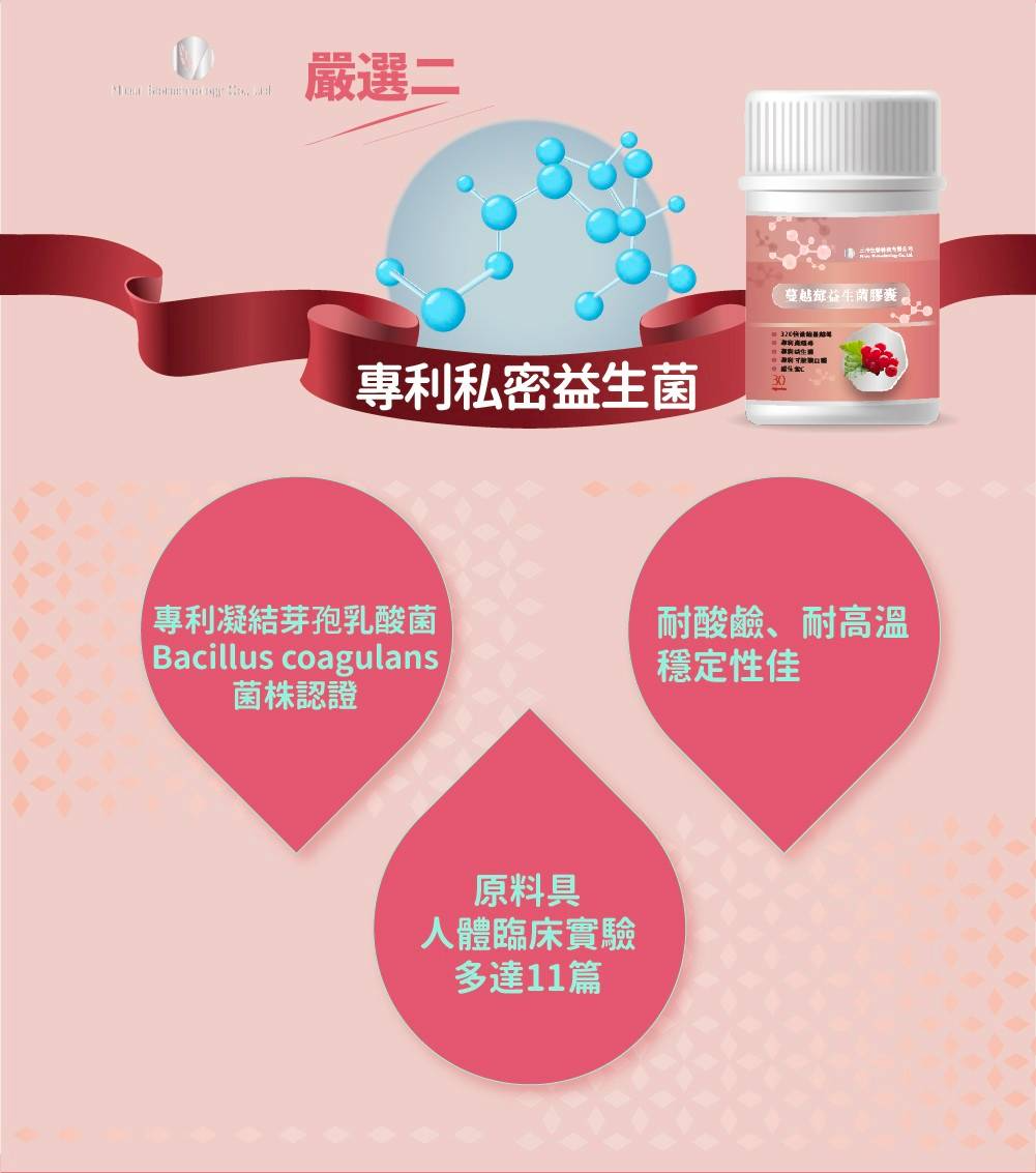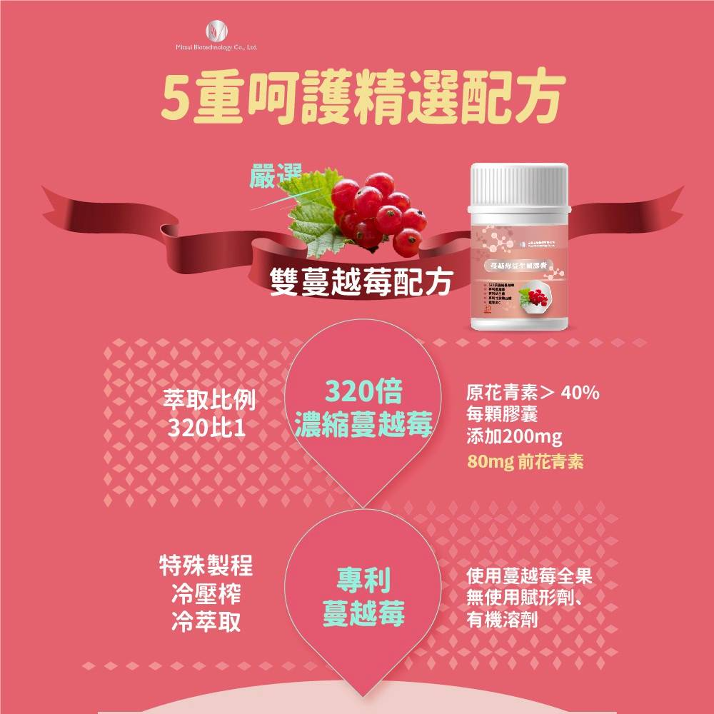 320倍濃縮蔓越莓、專利蔓越莓、專利益生菌、專利甘胺酸亞鐵、維生素C!五重呵護的秘密武器,每天1-2顆輕鬆補給!