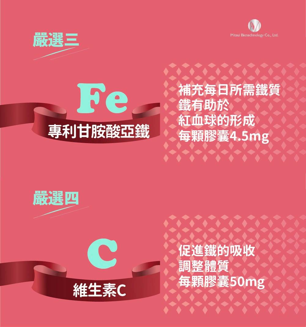 第三棒:添加內行消費者指定購買的甘胺酸亞鐵!鐵有助於正常紅血球的形成。構成血紅素與肌紅素的重要成分。有助於氧氣的輸送與利用。