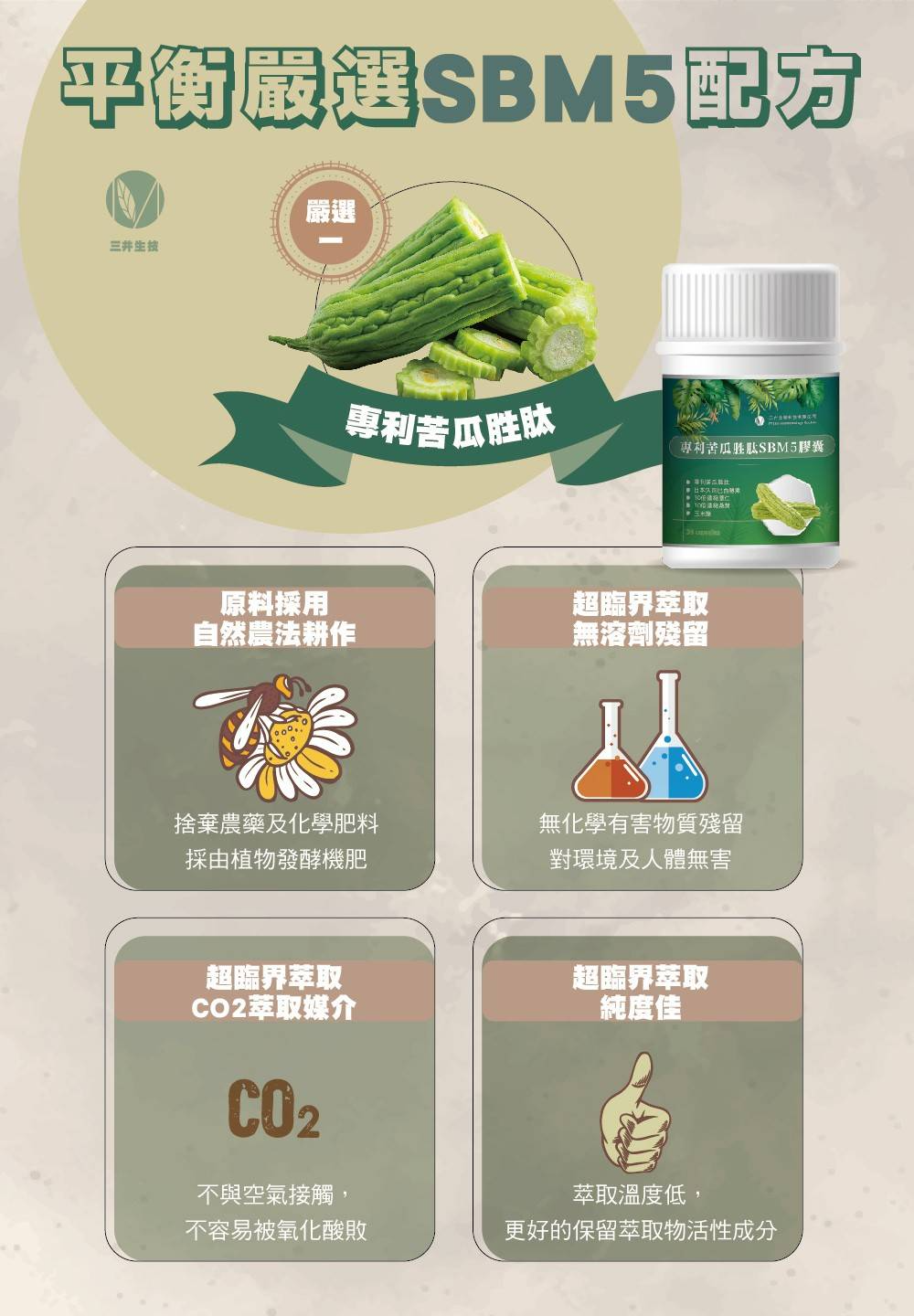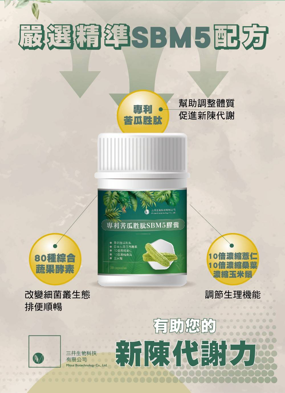 專利苦瓜胜肽基底配方,搭配四大機能原料,SBM5成就達成!調整體質、促進新陳代謝、輕鬆保養,但絕不馬虎!
