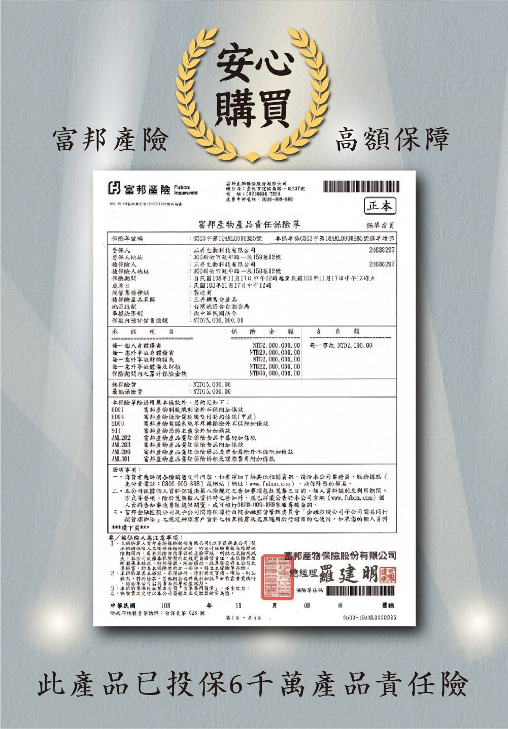 富邦產物保險6000萬產品責任險,安心有保證