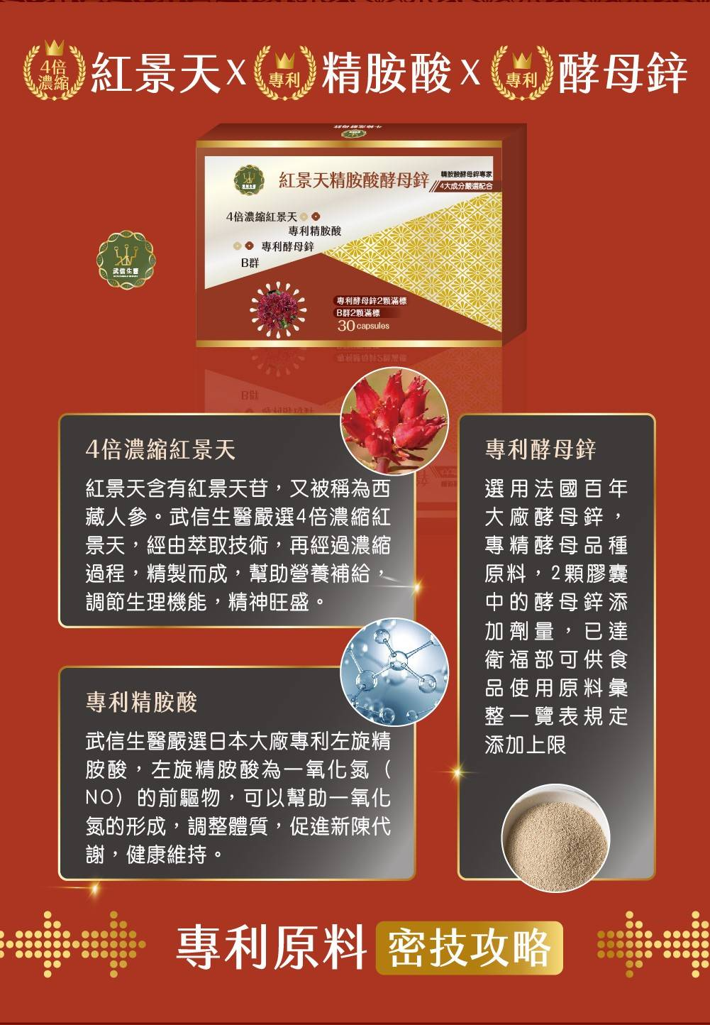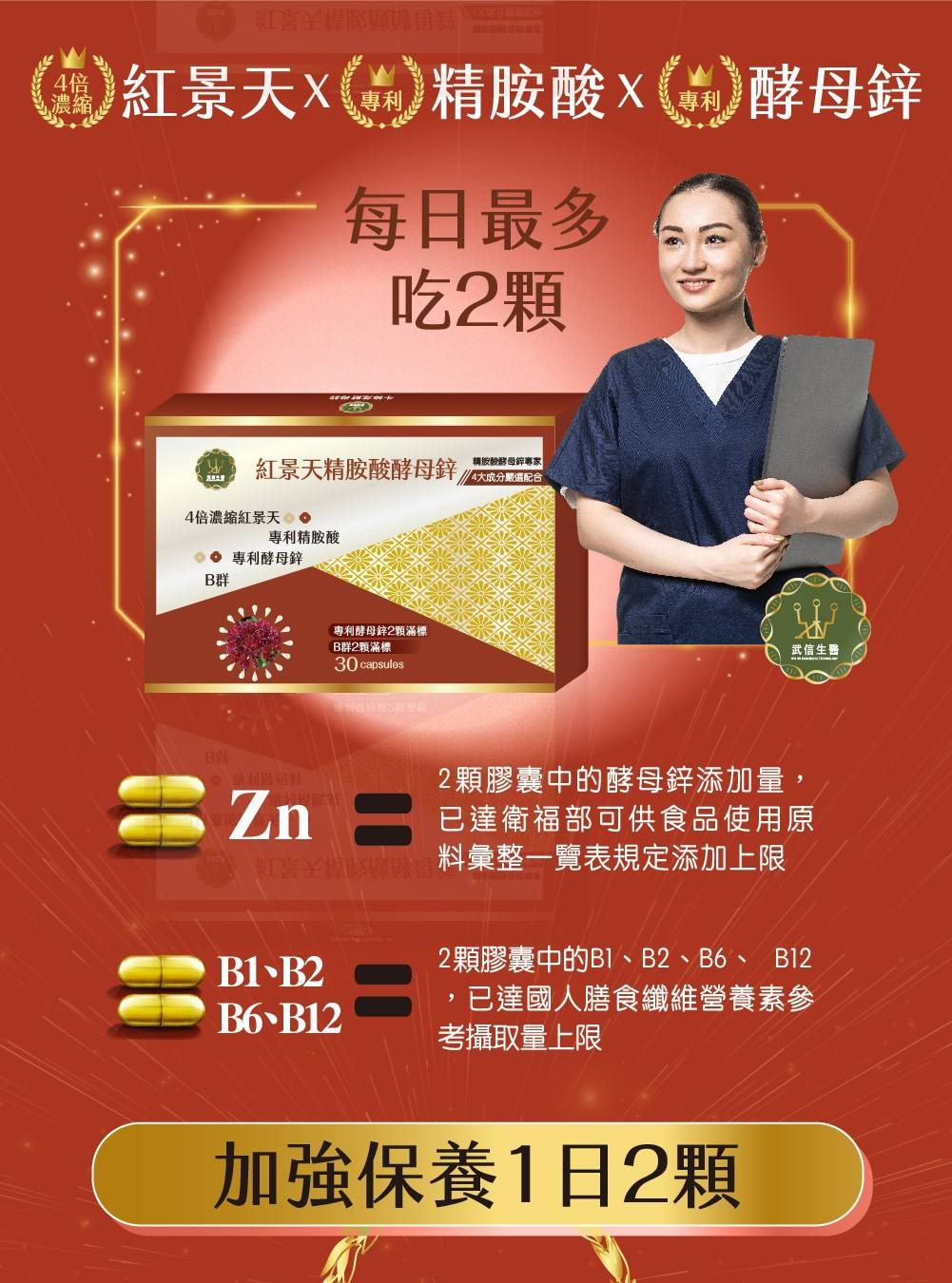 ●原料:4倍濃縮紅景天、精胺酸、酵母鋅、維生素B群(B1/B2/B6/B12)