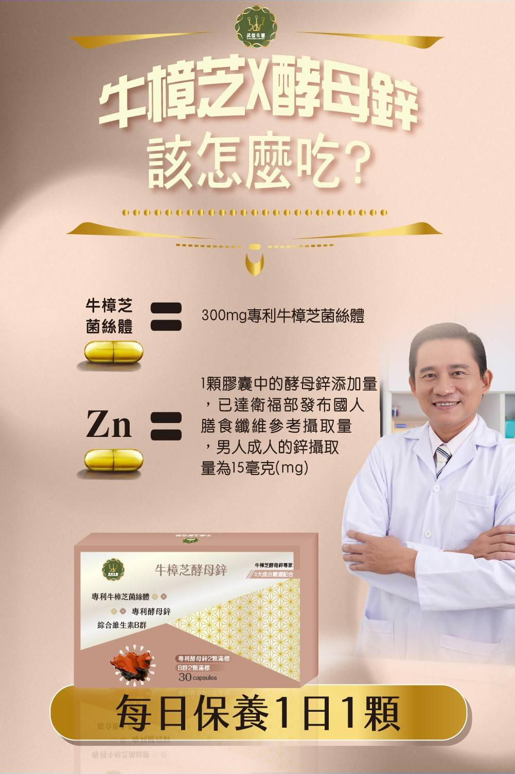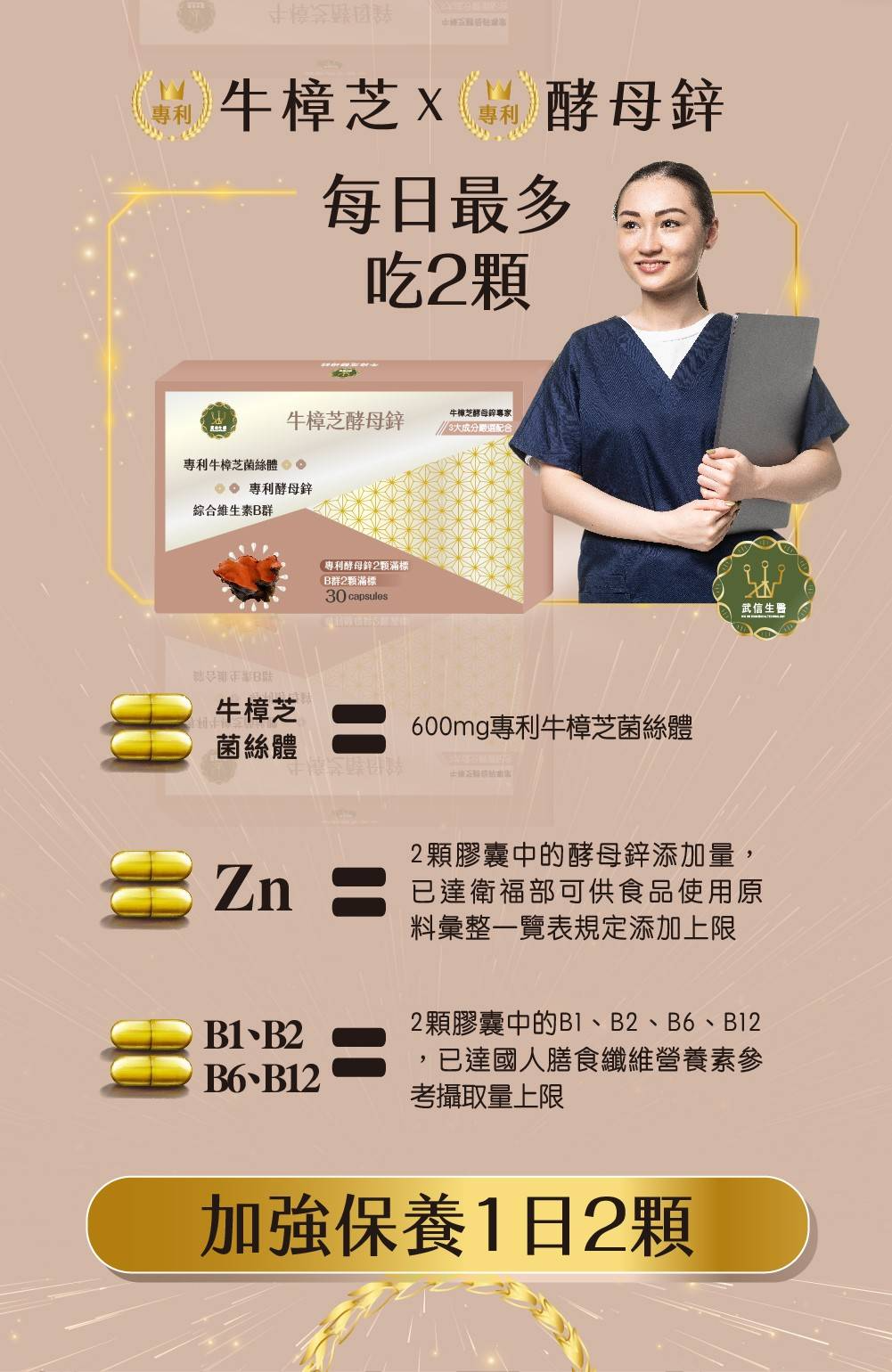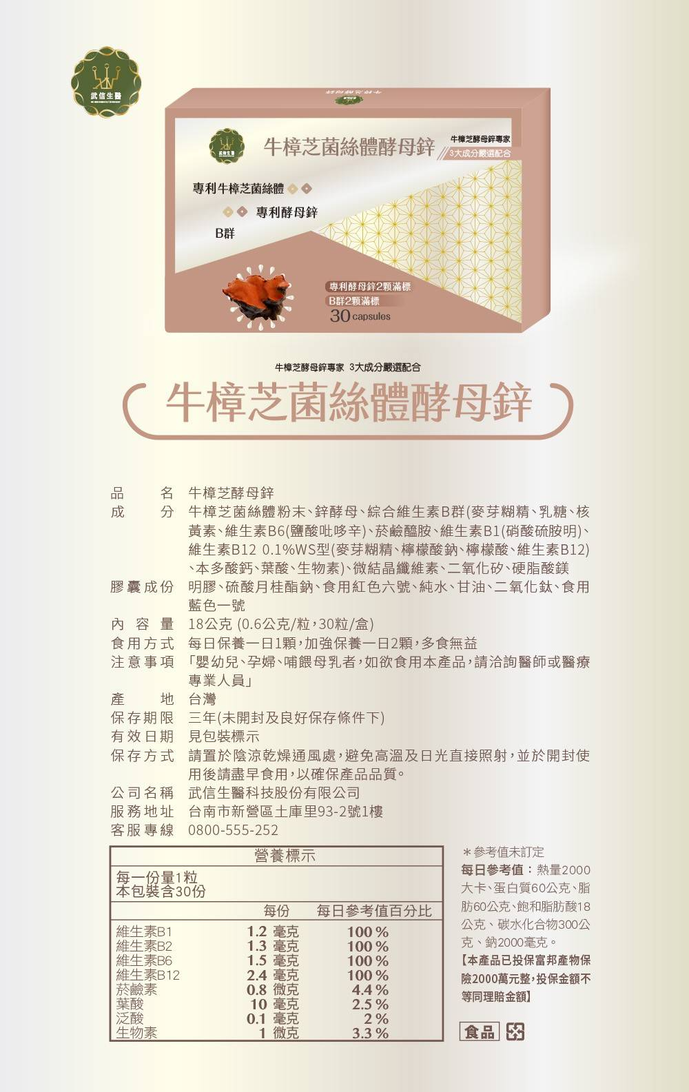 原料:牛樟芝菌絲體、酵母鋅、維生素B群(B1/B2/B6/B12)
