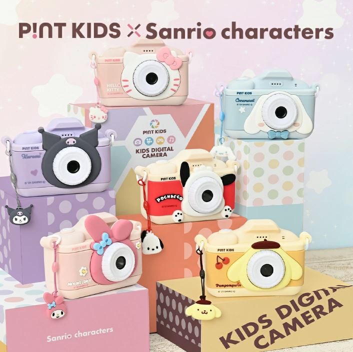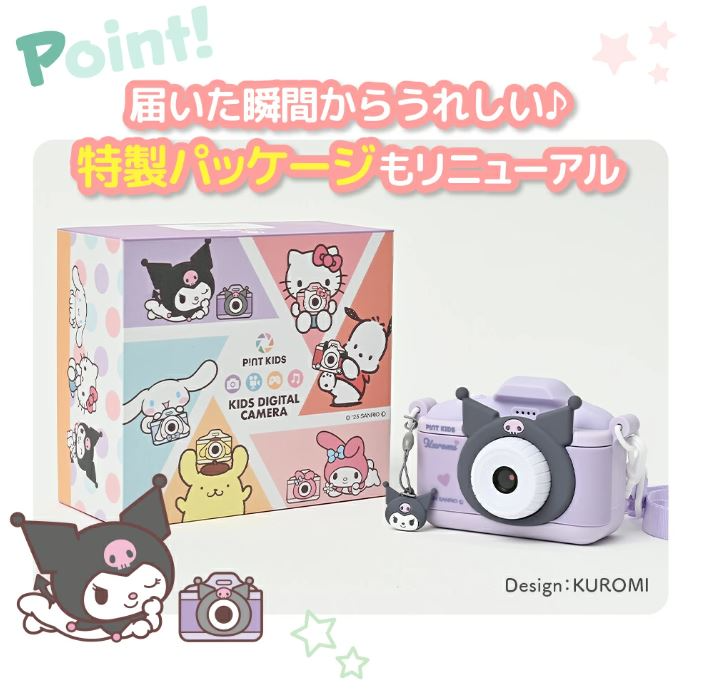 - 套裝內容:相機機身(三麗鷗卡通人物設計)、矽膠套、頸帶、USB(Type-C)數據線(用於充電/數據連接)、記憶卡(microSD 卡/32GB)、日文說明書。