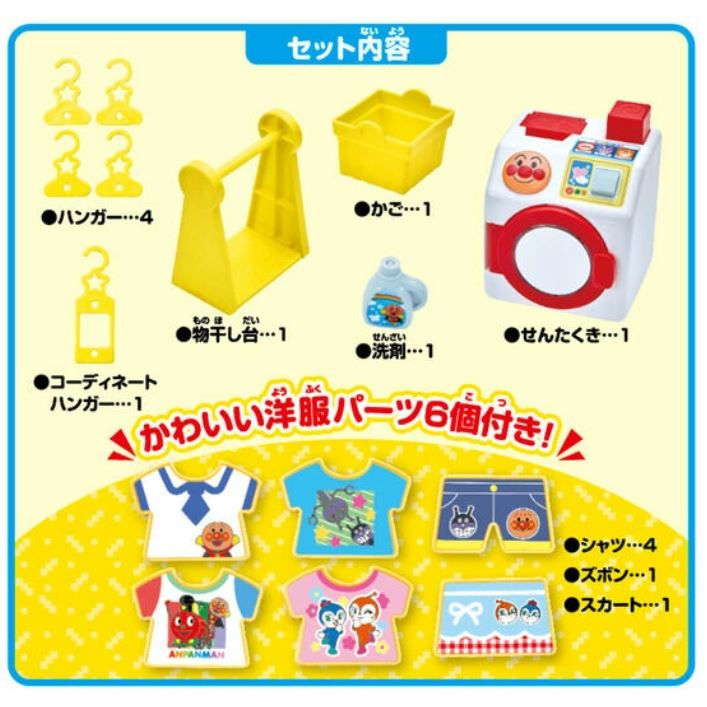 [套裝內容] 6件衣物(4件襯衫、1條褲子、1條裙子)、洗衣籃、洗衣精、晾衣架、4個配套衣架。需使用電池:3顆AAA電池(需另購)。 (不包含其他物品。)建議3歲以上兒童使用。製造商:BANDAI
