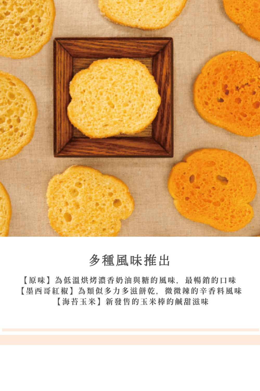獨具法式風情的烘焙點心RUSK,由師傅精心揉製出的法國長棍Baguette,再配上新鮮奶油的完美比例,融合成香氣十足、口感酥脆的美味,搭配中淺焙的單品咖啡或阿里山綠茶,讓人彷彿置身於浪漫的咖啡館中,品味悠閒又充滿藝術氛圍的生活。 【原味】為低溫烘烤濃香奶油與糖的風味,最暢銷的口味