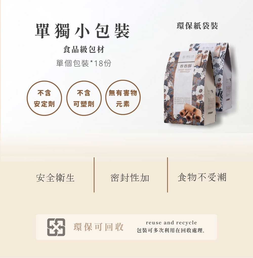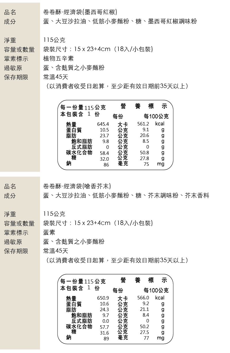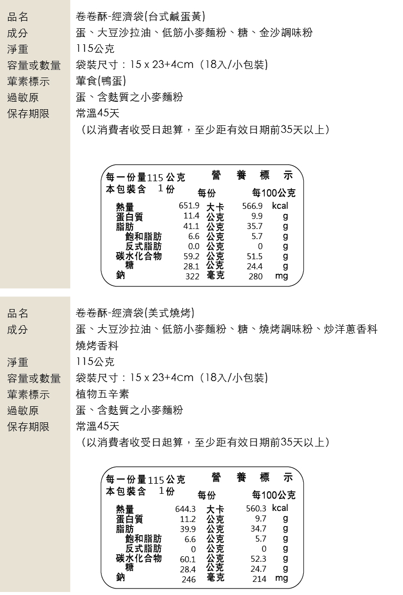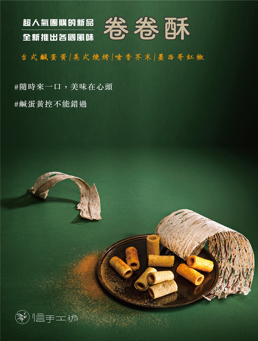 全新推出各國風味的一口即食卷卷酥,新鮮雞蛋製作,一層層的金黃酥脆蛋捲,經過多次調配出各種異國風味一口酥,【台式鹹蛋黃】銷售NO.1的鹹蛋黃風味搭配蛋捲【墨西哥紅椒】類似多力多滋的墨西哥紅椒【美式bbq】美式風味經典煙燻炭燒風味【嗆香芥末】受眾多人喜愛的日式嗆香風味。