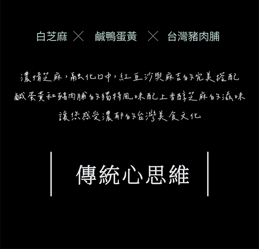 品味台灣的經典,芝麻燒粑將台灣的美味融入一口之中,口感獨特的麻糬搭配濃郁的紅豆沙,加上香脆鹹蛋黃和香氣四溢的台灣豬肉脯,最後撒上一層香甜芝麻,營造出絕妙的口感與味覺饗宴,這款經典之作結合了台灣的風味與創意,帶您品味純正的台灣美食文化,讓芝麻燒粑陪您一同探索台灣的美味之旅!