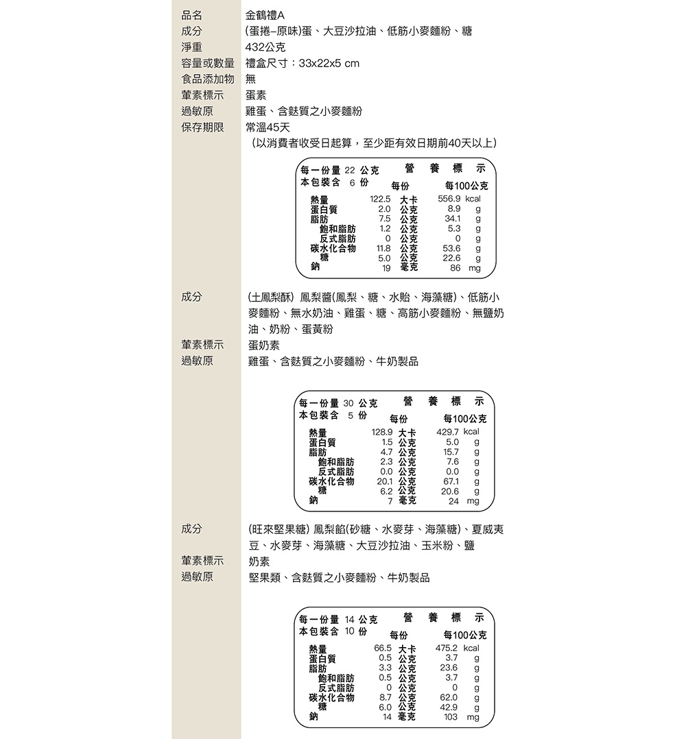 金鶴禮A:原味蛋捲x6+台灣風味酥x5+旺來堅果糖150g