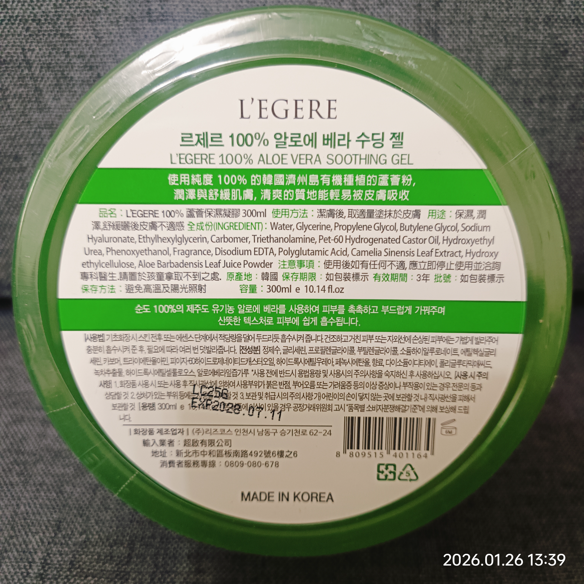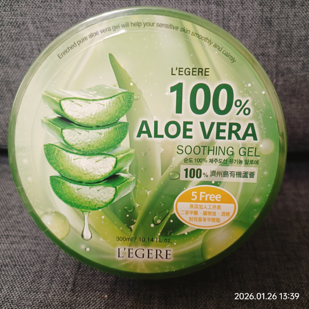 L'egere 蘭吉兒 韓國原裝進口100%蘆薈膠300ml 濟州島有機蘆薈膠 蘆薈保濕凝膠