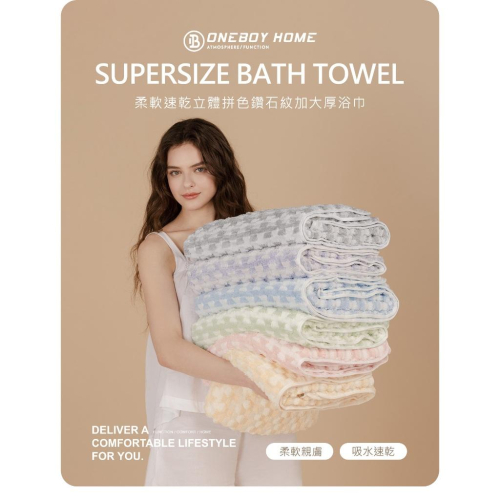 柔軟速乾立體拼色鑽石紋加大厚浴巾,機能與時尚的結合,立體拼色鑽石紋理,奢華美觀,同時給予肌膚柔軟的舒適體驗,兩種纖維結合,提升瞬間吸水力與速乾機能更健康,居家必備。
