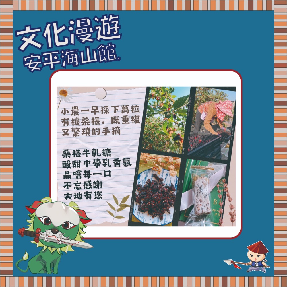 闆娘採用全台灣最適合種植桑椹,同時也是最大產地的嘉義, 義竹所出產的桑椹製作成果乾,並使用天然奶粉、天然奶油等食材, 透過傳統手工工法製成牛軋糖,再將桑椹果乾擁有天然的花青素融入雪白的牛軋糖中, 酸甜滋味一入口更是讓人回味無窮。