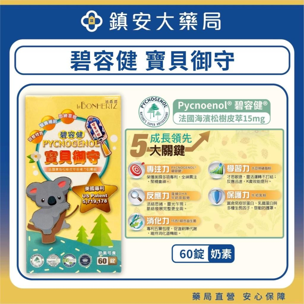 【守護寶貝的好選擇】 法森活 寶貝御守 碧容健 松樹皮複方咀嚼錠 PYCNOGENOL ® 碧容健 ® 【三大特色】 ◆榮獲美國功效專利 (U.S.A Patent 5,719,178) ◆補給孩童日常所需營養 ◆口感佳、可愛造型,兒童接受度高 【五大關鍵 】成長領先 1. 專注力 - Pycnogenol 碧容健 🎯榮獲美國多項專利,全神貫注,聚精會神。 2. 學習力 - 大豆卵磷脂 📖才思敏捷,盤活運轉不打結;反應迅速,K書效能提升。 3. 反應力 - 藻類DHA、牛奶萃取物 🔍活絡思緒,靈光乍現;脈絡發展完整更全面。 4. 保護力 - 牛初乳粉 🛡️富含免疫球蛋白、乳鐵蛋白與多種生長因子,啓動防護罩。 5. 消化力 - 15合1綜合益生菌 🦠專利五層包埋,促進新陳代謝,維持消化道機能。 成分:如圖所示 營養標示:如圖所示 內容量:60錠/盒 有效日期:請見包裝(日/月/西元年) 保存期限:三年 產地:台灣 建議用量:每天1~2錠,餐後咀嚼食用。 保存方式:避免放置於高溫以及濕度高的地方,避免日光照射,保存於陰涼處。 開封後請於一個月内食用完畢。 ※注意事項: 1.本産品含有乳糖及其製品。 2.如有特殊體質,請諮詢專業醫師後食用。 3.依個人體質或身體狀況不同,如食用後產生不適,請立即停止食用。 —————————————————————————————————————— 北市衛藥局字第5901025068號 藥局名稱:鎮安中西安和藥局 藥局諮詢專線:02-27015201 藥局地址:台北市大安區安和路1段123號1樓 📌購物須知 • 賣場商品圖片僅供參考,因電腦螢幕與手機螢幕皆會有色差,以收到實際商品為主 • 收到包裹請先開箱並錄影,若收到商品有損壞或與實際不符合,請至「聊聊」訊息客服,會有專人為您處理 • 個人衛生用品若經拆封恕無法申請退換貨(含貼身內衣褲、口罩、紙尿褲、奶嘴、奶瓶) • 賣場商品皆為現貨,下單後即會安排出貨,恕不接受聊聊更改訂單 • 申請退換貨商品必須保持全新未拆封,若經拆封恕不接受退換貨 • 出貨後物流配送天數:宅配約1-3天、超商約3-5天、蝦皮店到店約3-7天 ❤️安心宣言❤️ 鎮安中西安和藥局也許不是賣最低價格,但商品絕對是實體藥局的正品公司貨,也不會去除批號條碼。 我們提供最好的保健品專業以及服務品質,且對於售出的商品負責,讓您安心的購買。
