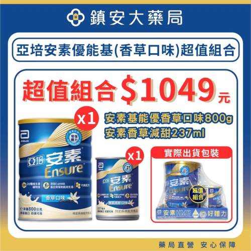 【4組以上請選宅配,超取拒收】 【4組以上請選宅配,超取拒收】 【4組以上請選宅配,超取拒收】 超值組合 亞培 安素優能基(香草口味)800g 附贈 安素香草減甜口味237ml 安素優能基(香草口味)800g x 1罐 安素香草減甜口味237ml x 1罐 優能基添加CaHMB提供完整均衡營養,3大營養素及28種維生素礦物質,每日飲用,可口飲補充三餐攝取不足的營養,適用於病後復健、需要增強體力者的營養補充。 添加CaHMB的升級配方。三重優質蛋白質(乳清蛋白、酪蛋白、大豆蛋白)可幫助肌肉生長。 【適用對象】 優能基添加CaHMB適合: ◎ 無法從日常飲食中得到足夠營養補充者 ◎ 體質虛弱者 ◎ 需要額外營養補充者   品名:亞培安素優能基均衡營養升級配方(香草口味) 進口商:美商亞培股份有限公司台灣分公司 地址:台北市民生東路3段51號6樓  免費營養諮詢:0800-036688 原產地:新加坡  包裝:淨重800公克  製造批號:請見罐底  有效日期:720天。且以消費者收受日起算,至少仍有1/3效期。 包裝在受保護的環境裡 ►食品業登錄字號:A-130961216-00000-6 ►產品責任險保單號碼:JAZ0500200/2023-011 【使用說明】 請在有效日期前使用。 一份230毫升的標準稀釋方法為:準備185毫升溫開水或涼開水,將6匙(罐內所附量匙)或60.6公克的安素優能基粉末加入溫開水或涼開水中緩慢攪勻一杯。當按照使用說明沖泡,安素溶液每一毫升可以提供1.14大卡的熱量。800公克粉狀配方可調配出約13份230毫升溶液。本產品可做為唯一營養來源,每日飲用1500大卡即可達到衛福部每日飲食中維生素與礦物質的建議攝取量(除氟營養素)。而在醫師或營養師指示下可做為部分營養補充,並可取代餐食。   【注意事項】 除非經醫師或合格的醫療專業人員指示,本品不建議給孩童使用。半乳糖血症者不適合食用。請勿由靜脈注射。本品屬特定疾病配方食品,不適合一般人食用,不適宜孕婦及未滿18歲者食用,須經醫師或營養師指導使用,可單獨管灌滿足需要。食用過量無助於疾病改善。本品含有牛奶、大豆及其製品。   【保存條件】 本產品未開罐前可存放在乾燥陰涼處。開罐後請儘速使用,且不可冷藏,並請於三週內用完。沖泡好的安素溶液請儘速喝完或加蓋冷藏,冷藏安素溶液請於24小時內用完。 ———————————————————————————————————————————————— 北市衛藥局字第5901025068號 藥局名稱:鎮安中西安和藥局 藥局諮詢專線:02-27015201 藥局地址:台北市大安區安和路1段123號1樓 📌購物須知 • 賣場商品圖片僅供參考,因電腦螢幕與手機螢幕皆會有色差,以收到實際商品為主 • 收到包裹請先開箱並錄影,若收到商品有損壞或與實際不符合,請至「聊聊」訊息客服,會有專人為您處理 • 個人衛生用品若經拆封恕無法申請退換貨(含貼身內衣褲、口罩、紙尿褲、奶嘴、奶瓶) • 賣場商品皆為現貨,下單後即會安排出貨,恕不接受聊聊更改訂單 • 申請退換貨商品必須保持全新未拆封,若經拆封恕不接受退換貨 • 出貨後物流配送天數:宅配約1-3天、超商約3-5天、蝦皮店到店約3-7天 ❤️安心宣言❤️ 鎮安中西安和藥局也許不是賣最低價格,但商品絕對是實體藥局的正品公司貨,也不會去除批號條碼。 我們提供最好的保健品專業以及服務品質,且對於售出的商品負責,讓您安心的購買。