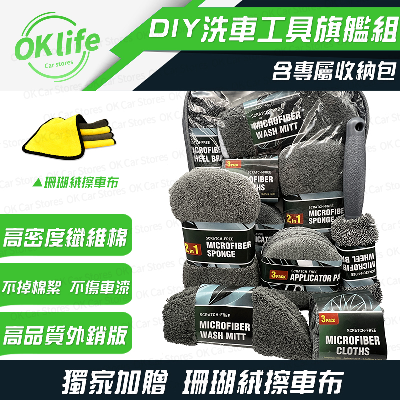 DIY洗車組 洗車工具 洗車海綿 輪圈刷 打蠟海綿 擦車布 附專屬收納包 高密度纖維布 不傷車漆不掉棉絮