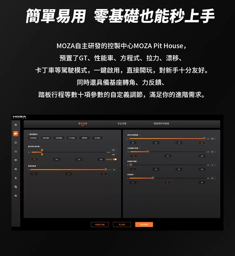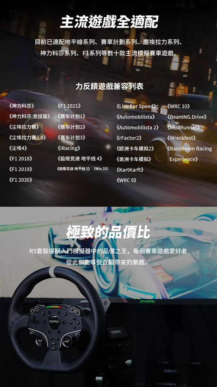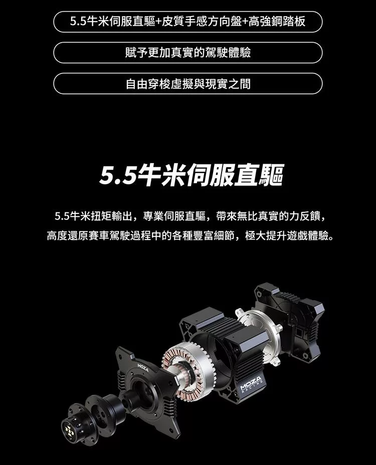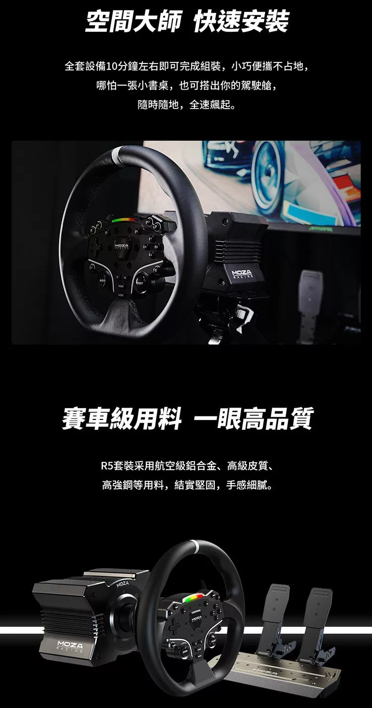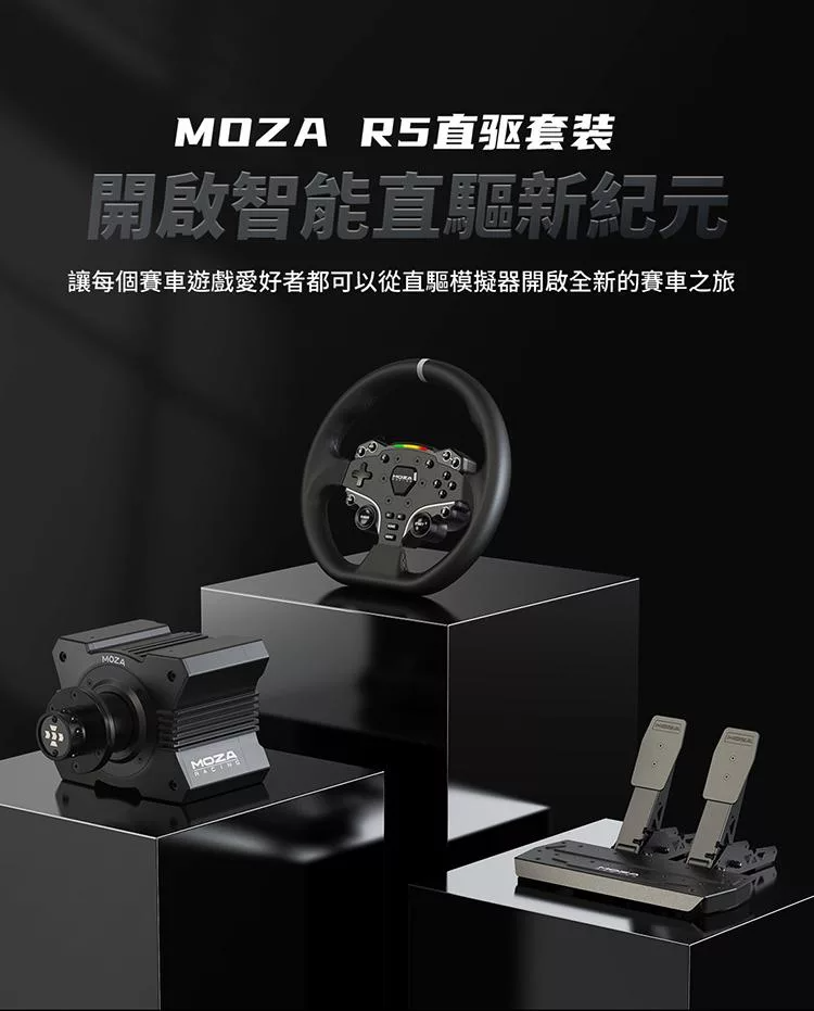 產品內容物 : .MOZA R5 直驅馬達 .MOZA ES 盤面 .MOZA SR-P Lite 雙踏板 .MOZA R5專用 夾具 產品規格: ‧外箱尺寸:434*420*278 ‧重量:12.8KG