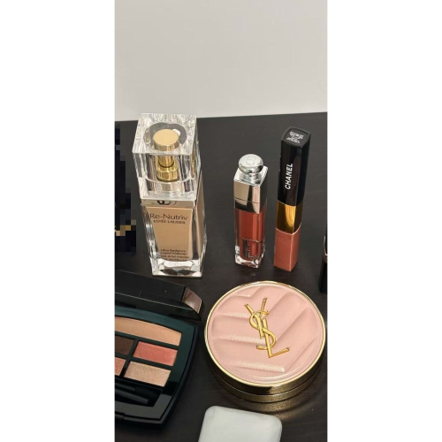 雅詩蘭黛白金粉底液+迪奧豐唇蜜+香奈兒雙頭唇釉+香奈兒五色眼影+粉皮革氣墊