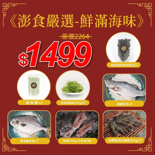 黃金鯧全魚500gX1、海鱸魚500gX1、黑潮特選白蝦300gX1、、極凍鮮透抽2入(共400g)X1、極品絕配昆布鹽100g袋裝X1、澎湖珊瑚草200gX1、海帶芽40克(青蔥)X1