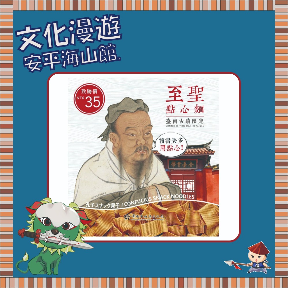 臺南市政府文化局賣力推廣在地觀光產業,最近更請來大家從小就知道的重量級人物的「至聖先師」孔子代言!聯手知名點心麵品牌優雅食推出臺南限定的「至聖點心麵」,融合孔子及國定古蹟臺南孔廟的圖像,包裝上還祭出正能量口號「一定要致勝!」、「讀書要多用點心!」幫你加持、打氣,是不是想快品嚐?