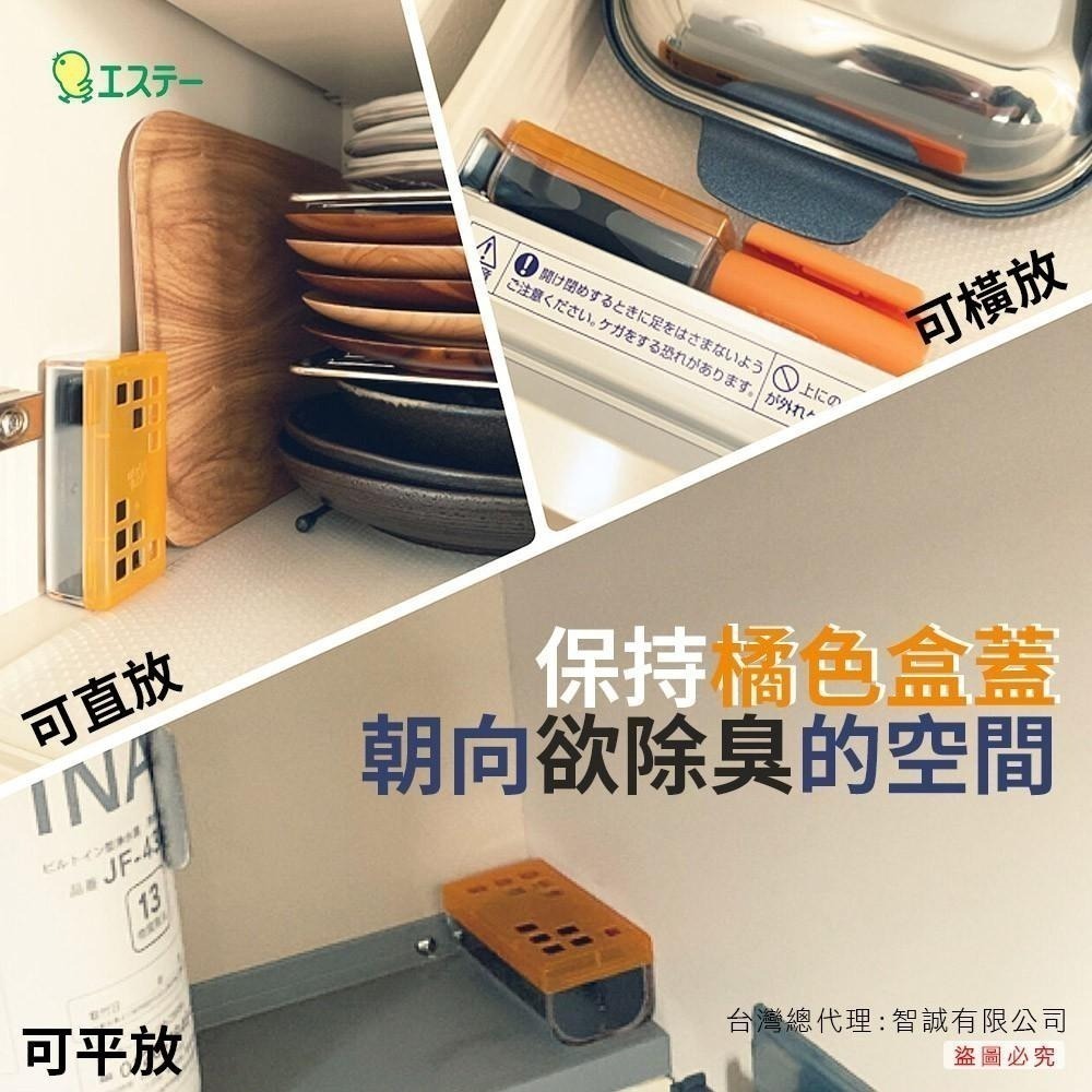 放置方式,可直放、橫放、平放皆可(但要保持橘色盒蓋朝向欲除臭的空間)。