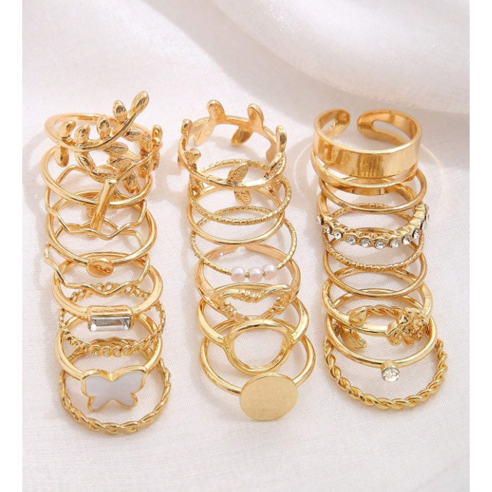 24入組鑲嵌水鑽假珍珠幾何戒指套裝