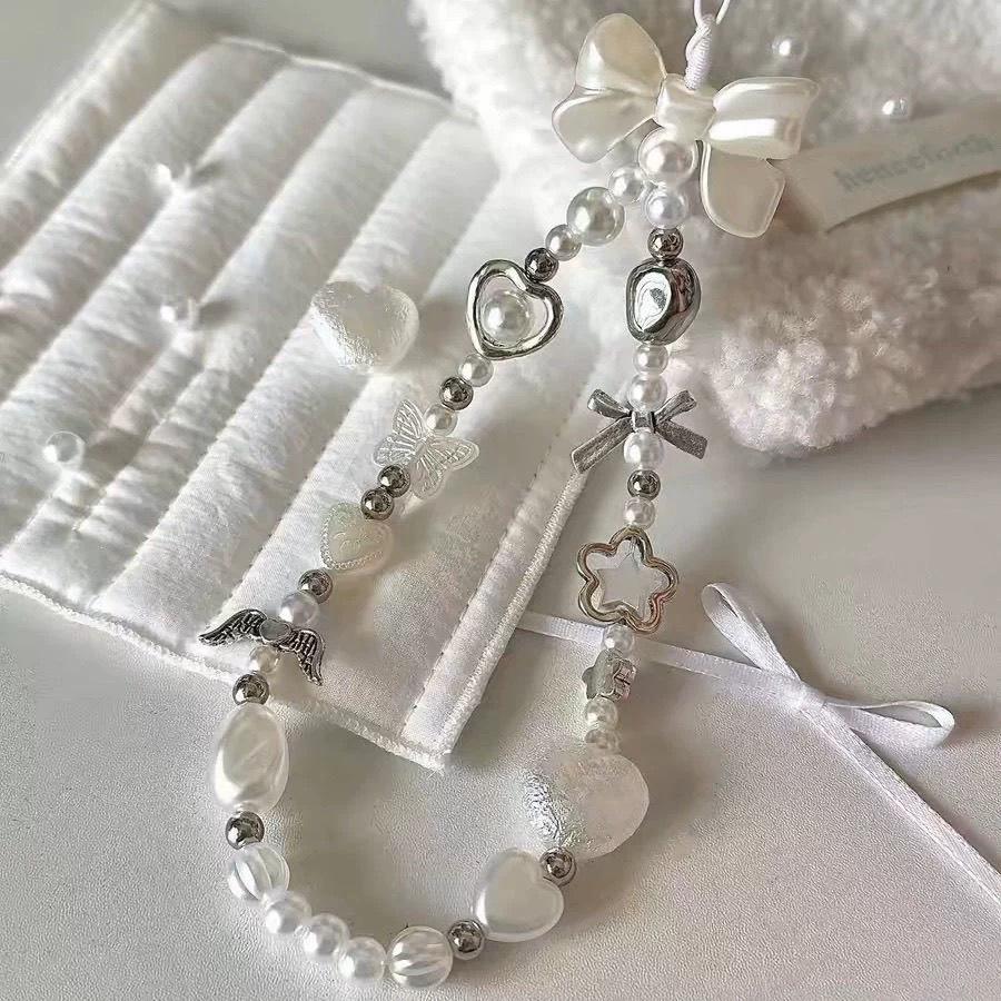 自製愛心珍珠蝴蝶結巴洛克風手機鏈ccd相機掛件 手機掛繩掛鏈 手機吊飾裝飾鍊條 手機殼裝飾 手機繩手環繩
