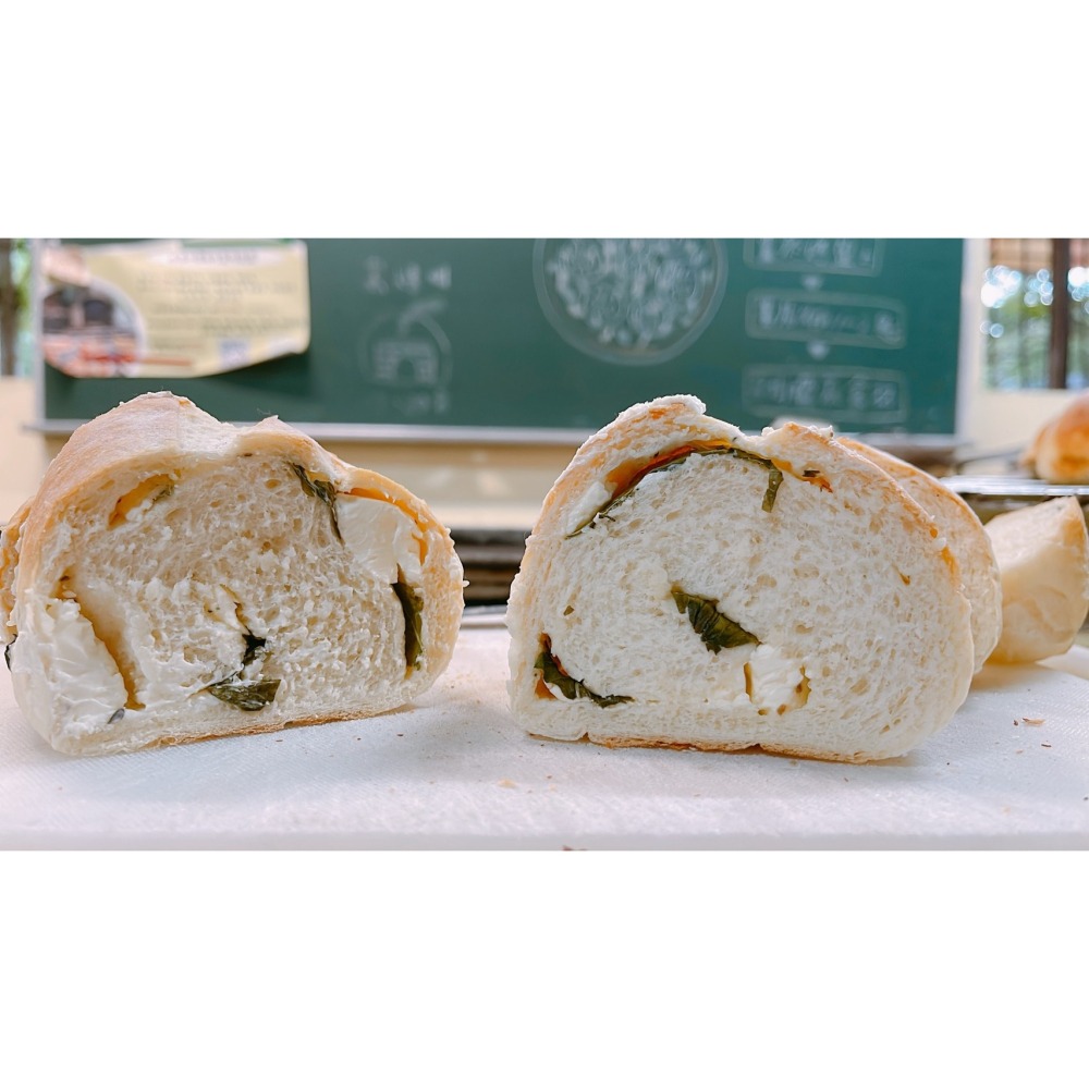 👉麵包噴水大火微波2分,麵包對切噴水再微波1分,烤箱180度1分鐘