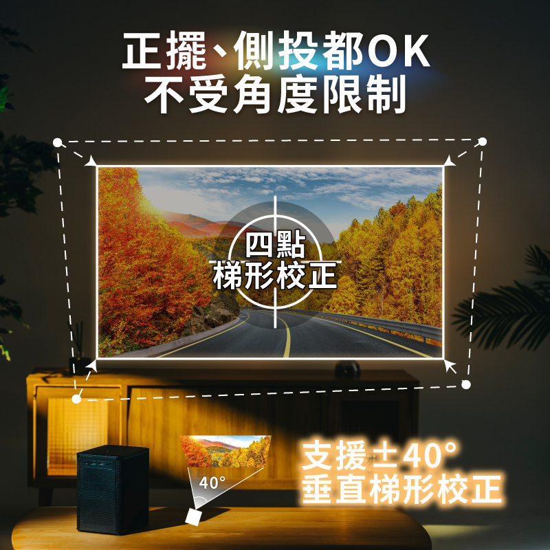 ✔ 自動對焦&智慧梯形校正,左右垂直達40度