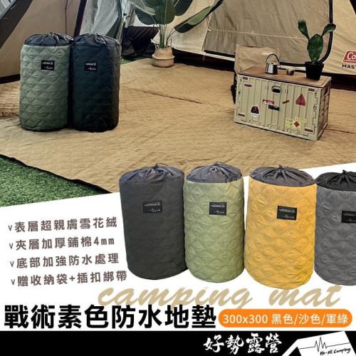不喜歡太花俏 喜歡素素的戶外潮流風格嗎? 找不到舒服的地墊嗎? 還在為地墊買收納袋嗎? 🎉現在買地墊就加碼送收納袋和插扣式收納綁帶唷! ✔表層超親膚雪花絨材質 ✔夾層加厚鋪棉厚達4mm ✔底部加強防水處理 再也不用怕反潮 ✔X型固定棉放水縫線 ✔加贈同色收納袋 ✔加贈插扣式收納綁帶 ✔戶外潮流色|黑色|沙色|軍綠|灰色| 【商品規格】 尺寸:300*300cm 收納尺寸:23*23*48cm 重量:3.25kg 材質:表層-雪花絨/夾層-舖棉/底層-防水材質 【注意事項】  1.產品因拍攝及個人電腦顯示器色溫關係,顏色可能略有差異,實際以廠商出貨為主。 2.鑑賞期非試用期,為了保障每位客人購買到真正全新的商品的權益,不接受「要使用過才知道好不好用」或類似的理由要求已使用過之商品的退貨。 若有試用需求,歡迎至好勢露營實體展示店面試用 3.木製、鐵製或塑膠其他製品都有天然紋路或些微製程痕跡,如有完美主義者,請於購買前謹慎考慮後,再下單購買。 4.所有商品於出貨前皆會進行檢查,收到商品時,請錄影拆箱,商品請第一時間在家測試沒問題再帶到營區使用,一旦帶到營區使用即不接受退換貨。 5.與衛生有關之產品,例如睡袋、枕頭類、充氣床、接觸人體皮膚之產品,一旦打開過即無法退換貨(因無法證明沒有使用過) 【保留出貨權條款】 本網站保留出貨與否之權利. 為保障彼此之權益,賣家在收到您的訂單後仍保有決定是否接受訂單及出貨與否之權利。 如因商品缺貨、停產、瑕疵、資料不正確或系統問題等 ... 🚩追蹤粉絲專頁,好康消息不漏接 不定期推出驚喜優惠活動、折扣券!  FB粉絲團搜尋『好勢露營 Ho-sè Camping』 https://s-cf-tw.shopeesz.com/file/f463dbfdace1afd451c00b9a8721f2f4