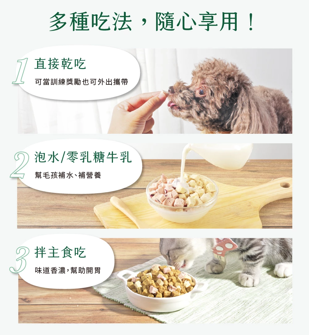 • 天然凍乾雞肉提味,貓咪狗狗都愛吃!