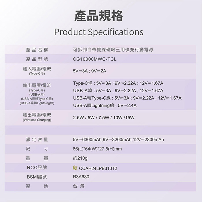 .輸入電壓/電流(Type-C埠):5V⎓3A;9V⎓2A