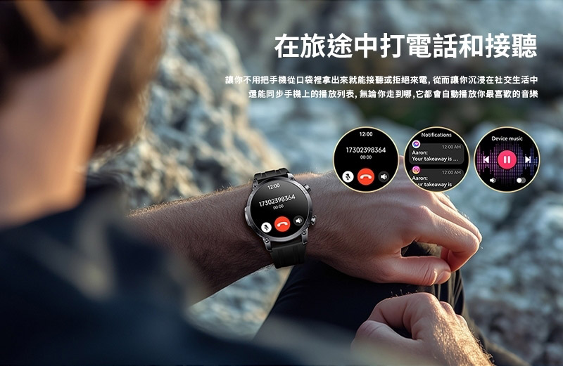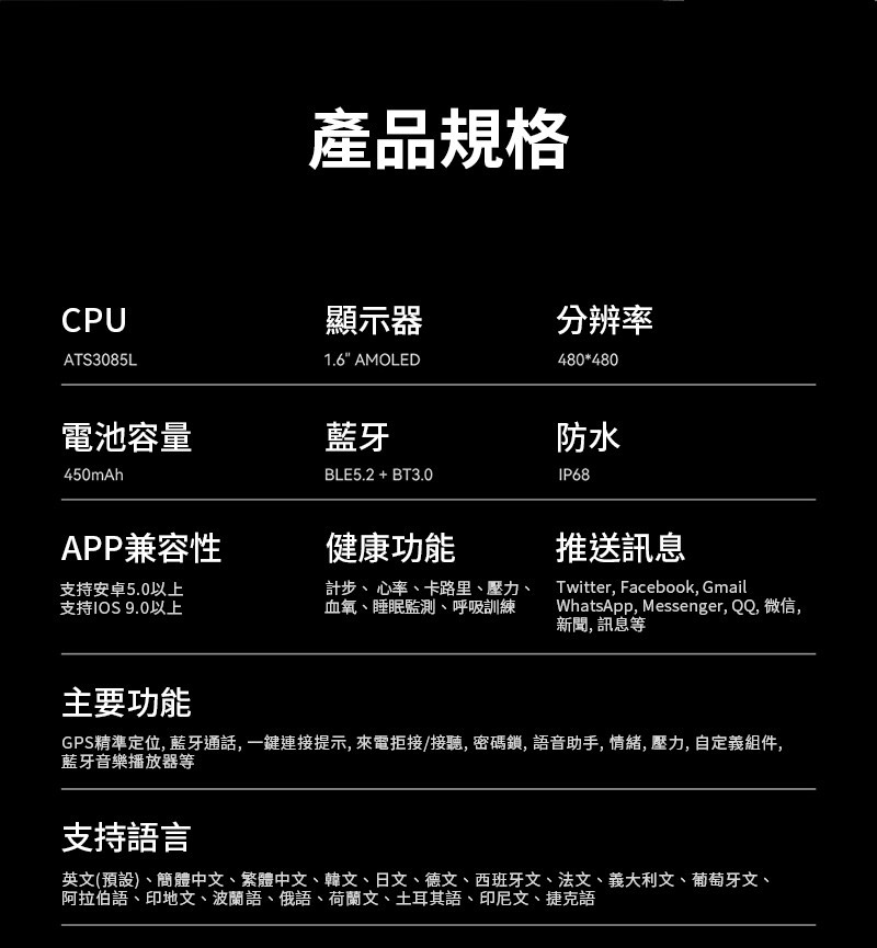 .智慧功能:藍牙通話、來電通知、語音助理、自定義錶盤